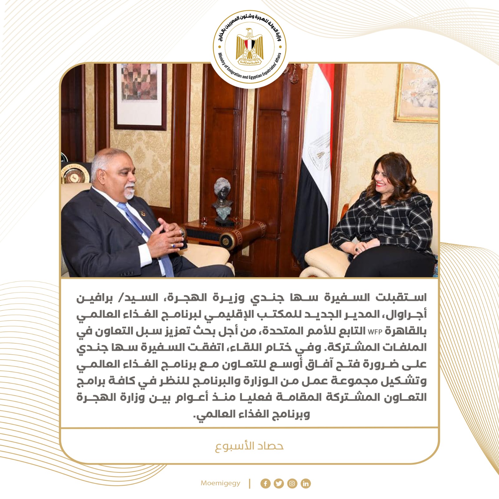 واستقبلت السفيرة سها جندي وزيرة الهجرة، برافين أجراوال، المدير الجديد للمكتب الإقليمي لبرنامج الغذاء العالمي بالقاهرة WFP التابع للأمم المتحدة، من أجل بحث تعزيز سبل التعاون في الملفات المشتركة. وفي ختام اللقاء، اتفقت السفيرة سها جندي على ضرورة فتح آفاق أوسع للتعاون مع برنامج الغذاء العالمي وتشكيل مجموعة عمل من الوزارة والبرنامج للنظر في كافة برامج التعاون المشتركة المقامة فعليا منذ أعوام بين وزارة الهجرة وبرنامج الغذاء العالمي، وكذلك بحث مزيد من التعاون فيما يتعلق بتدريب صغار المزارعين وأهالي المناطق الريفية وخاصة السيدات ودعم التعاون في مجال المنتجات والحرف اليدوية والصناعات الغذائية وتدريب الفلاحين والفلاحات عليها في مختلف المراكز المهنية التابعة لبرنامج الغذاء العالمي في كافة المحافظات المصرية وعلى رأسها المحافظات المصدرة للهجرة غير الشرعية.