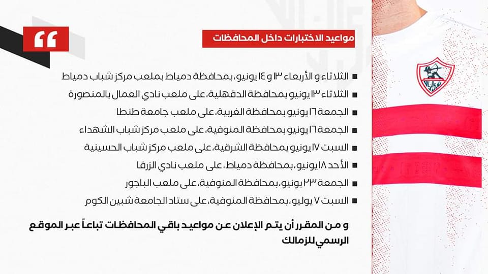 اختبارات نادي الزمالك في المحافظات 2023 -2024