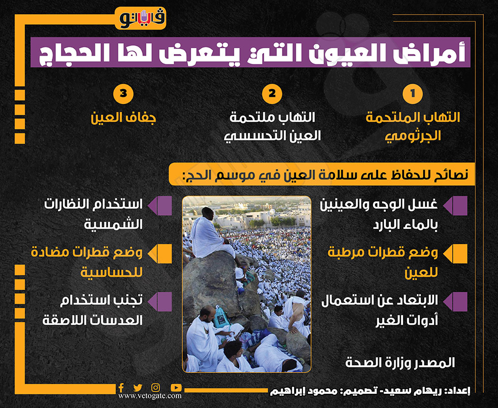 أمراض العيون التي يتعرض لها الحجاج (إنفوجراف) السبت 10/يونيو/2023 - 07:03 م 6/10/2023 7:03:45 PM موسم الحج ٢٠٢٣ ريهام سعيد شارك طباعة 18 حجم الخط شارك طباعة التهاب الملتحمة العدسات اللاصقة النظارات الشمسية وزارة الصحة موسم الحج جفاف العين