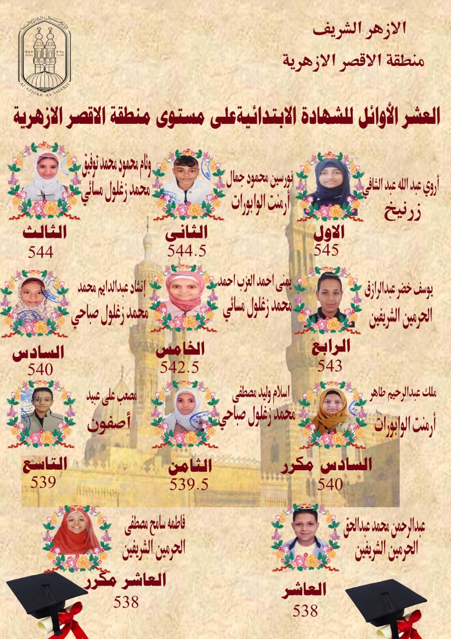 تنشر بوابة فيتو أسماء أوائل الشهادة الإعدادية والابتدائية الأزهرية بمحافظة الأقصر.
