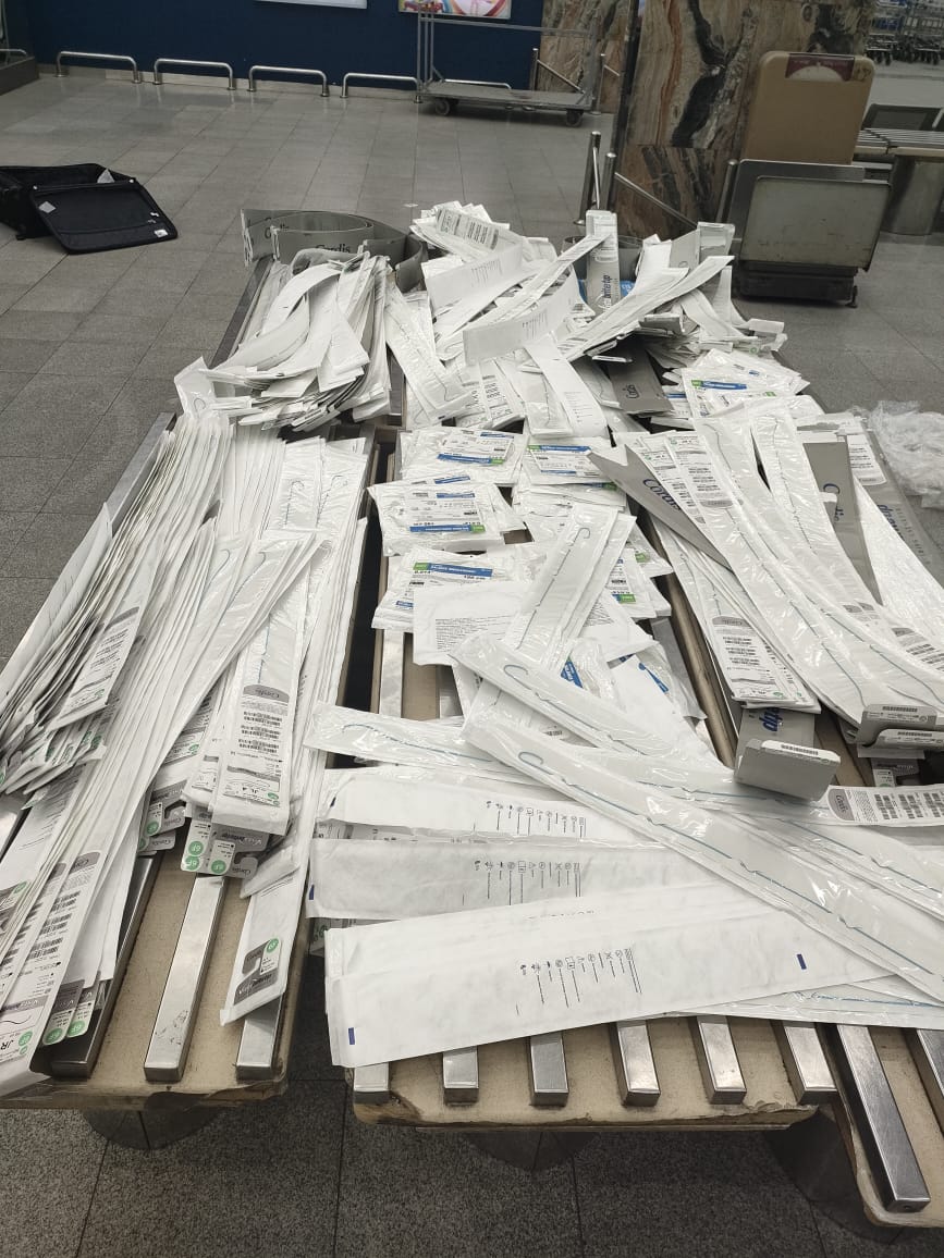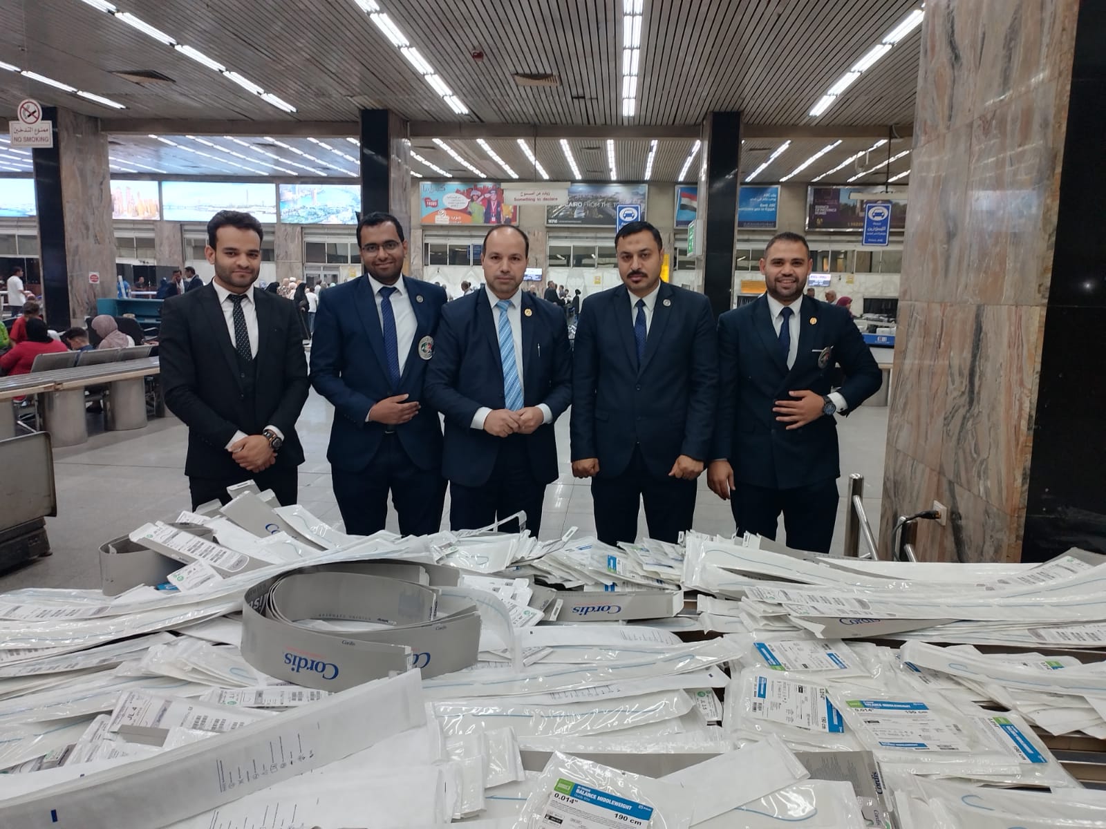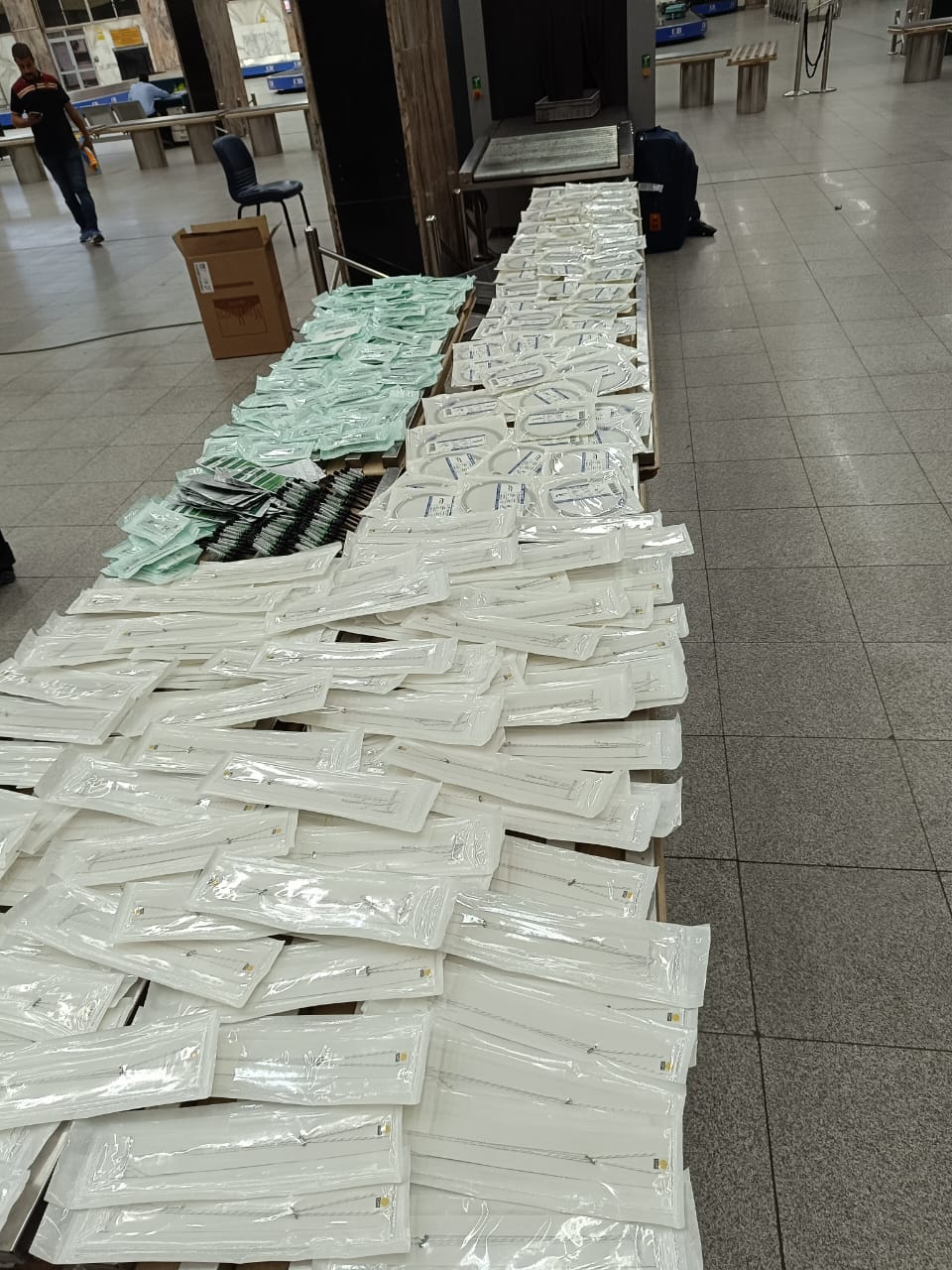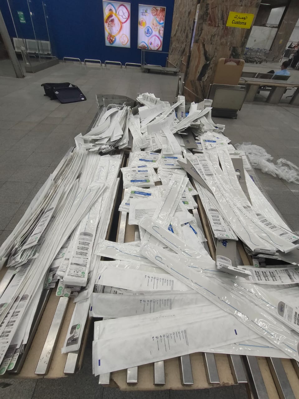 وبتفتيش حقائب الراكب علي جهاز الفحص بالأشعة بواسطة كل من محمد مرسي مأمور الجمرك، وهاني مصطفى رئيس القسم، واللذان تلاحظ لهما وجود عبوات متكررة ومتماثلة بكثرة داخل حقائب الراكب، قام محمد أمين مدير الحركة المشرف على صالة الوصول رقم ١ بمبني الركاب رقم ١، بتكليف أحمد محمد رفاعي مأمور الجمرك، بتفتيش حقائب الراكب يدويا مما أسفر عن ضبط كمية كبيرة من المستلزمات الطبية، قام ايمن شملول مدير الجمرك، بتكليف لجنة مكونه من احمد الصغيرين ومحمد عدلي وأحمد امين ومجدي عزت وهشام عطية مأموري الجمرك، بإشراف محمود سليمان مدير الحركة، وفي حضور علي فهمي من إدارة الامن الجمركي، وذلك لجرد وتوصيف وتحريز المضبوطات والتي بلغ عددها ٤٠٧ قسطرات طبية.
