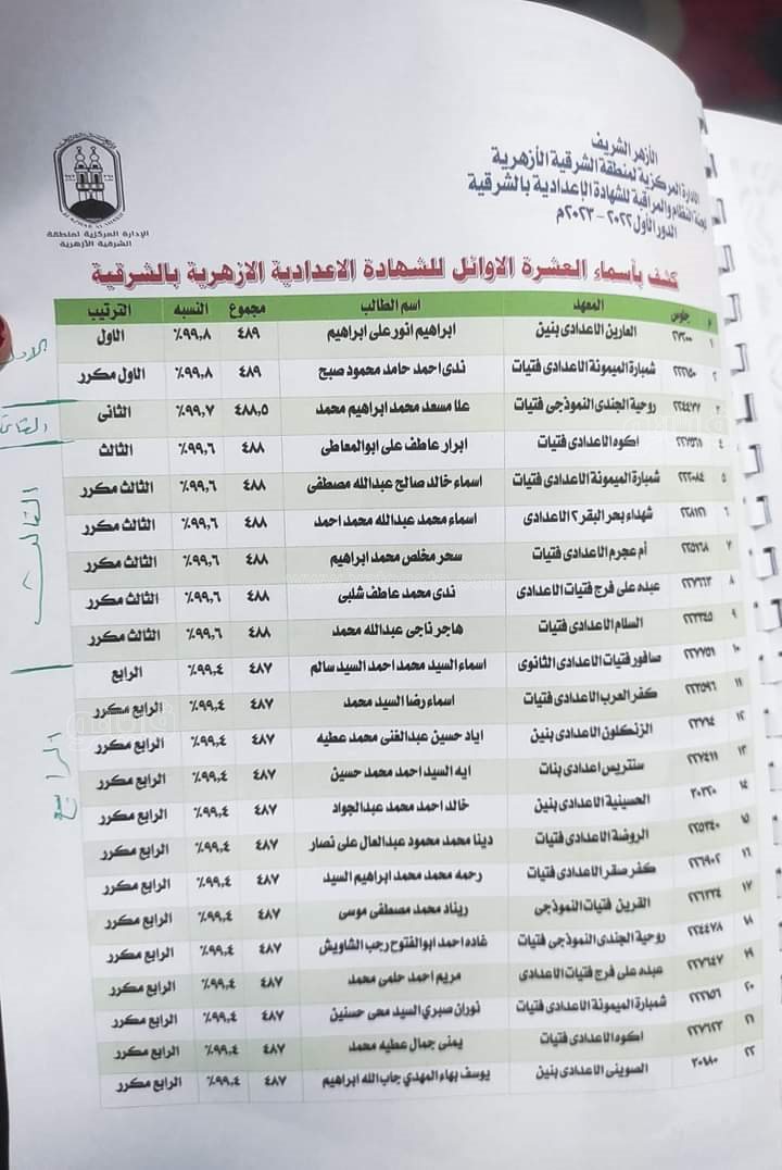 وأصدرت منطقة الشرقية الأزهرية بيان تضمن أسماء أوائل الشهادة الاعدادية الأزهرية 2023 في الشرقية حصلت فيها الطالب ابراهيم انورعلي ابراهيم من معهد العارين الاعدادي بنين الاول علي المنطقة الازهرية بمجموع 489 درجة بنسبة 99.8% والطالبة ندى احمد حامد محمود من معهد شمبارة الميمونة الاعدادى فتيات علي الترتيب الاول مكرر بمجموع درجات 488.5 درجة بنسبة 99.8%.