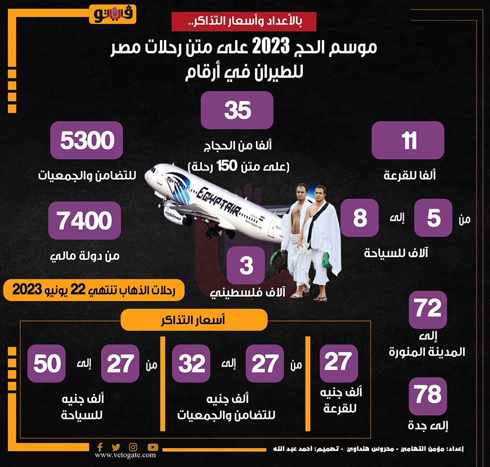 بالأعداد وأسعار التذاكر.. موسم الحج 2023 على متن رحلات مصر للطيران في أرقام (انفوجراف) الأحد 11/يونيو/2023 - 04:54 م 6/11/2023 4:54:45 PM موسم الحج 2023 على متن رحلات مصر للطيران في أرقام، فيتو مؤمن التهامي - محروس هنداوي شارك طباعة 18 حجم الخط شارك طباعة أسعار تذاكر الحج المدينة المنورة رحلات مصر للطيران موسم الحج مصر للطيران الحجاج