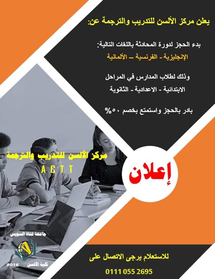 أعلن الدكتور ناصر مندور رئيس جامعة قناة السويس، عن تنظيم مركز الألسن للتدريب والترجمة التابع لكلية الألسن بالجامعة، لمجموعة من الدورات التدريبية المقدمة لطلاب المدارس الابتدائية والإعدادية والثانوية في المحادثة باللغات (الإنجليزية والفرنسية والألمانية)، وذلك خلال إجازة الصيف.