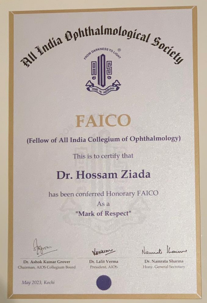 منحت كلية جمعية عموم الهند للعيون الدكتور حسام زيادة، الأستاذ المساعد بقسم طب وجراحة العيون بكلية طب بنين جامعة الأزهر بالقاهرة، زمالة كلية جمعية عموم الهند للعيون؛ نظرًا لتميزه العلمي في مجال طب وجراحة العيون على مستوى العالم: