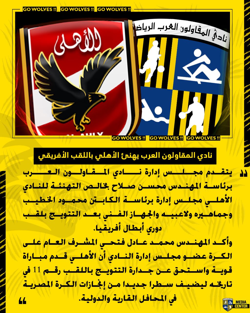 تقدم مجلس إدارة نادي المقاولون العرب برئاسة المهندس محسن صلاح بخالص التهنئة للنادي الأهلي مجلس إدارة برئاسة الكابتن محمود الخطيب وجماهيره ولاعبيه والجهاز الفني بعد التتويج بلقب دوري أبطال أفريقيا.