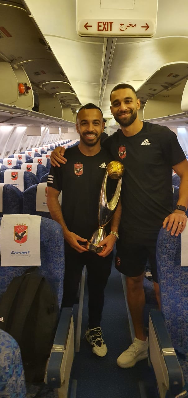 وحرص طاقم الضيافة الجوية على الاحتفال بفريق النادي الأهلي قبل إقلاع الطائرة من كازبلانكا، والتقاط الصور التذكارية مع الفريق وكأس البطولة.