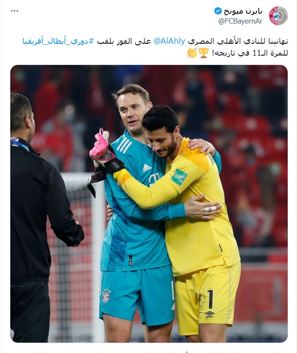 ونشر نادي بايرن ميونخ عبر الفيس بوك نفس الصورة التي تجمع محمد الشناوي ومانويل نوير حارس الفريق البافاري، وكتب بايرن ميونخ: "تهانينا للنادي الأهلي المصري الفوز بدوري أبطال أفريقيا للمرة الثانية على التوالي والعاشرة في تاريخه."