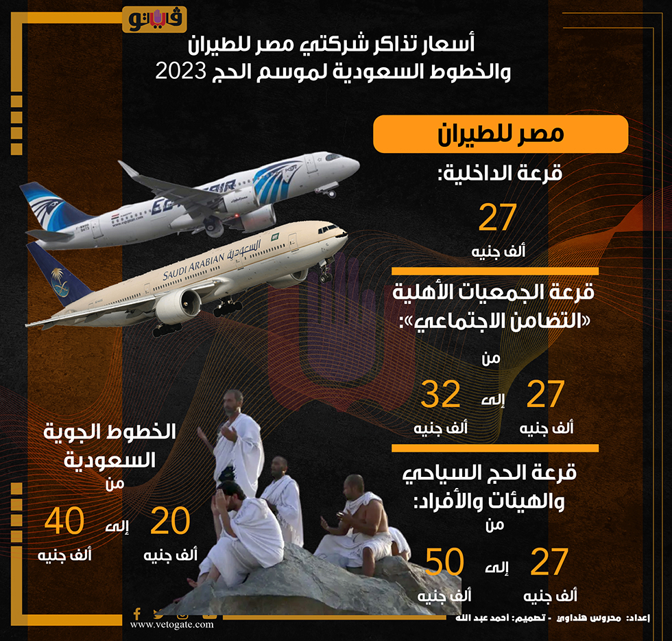 أسعار تذاكر شركتي مصر للطيران والخطوط السعودية لموسم الحج 2023 (انفوجراف) الإثنين 12/يونيو/2023 - 03:57 م 6/12/2023 3:57:27 PM الحج محروس هنداوي شارك طباعة 18 حجم الخط شارك طباعة الحج الحج السياحى قرعة الحج الخطوط السعودية مصر للطيران اسعار تذاكر طيران الحج اسعار برامج الحج