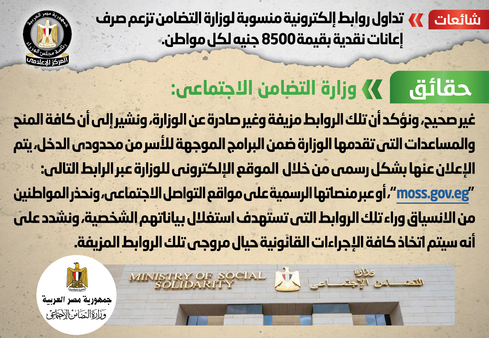 رصد المركز الإعلامي بمجلس الوزراء تداول بعض مواقع التواصل الاجتماعي وجروبات تطبيق "الواتس اب" روابط إلكترونية منسوبة لـ وزارة التضامن تزعم صرف إعانات نقدية بقيمة 8500 جنيه لكل مواطن.