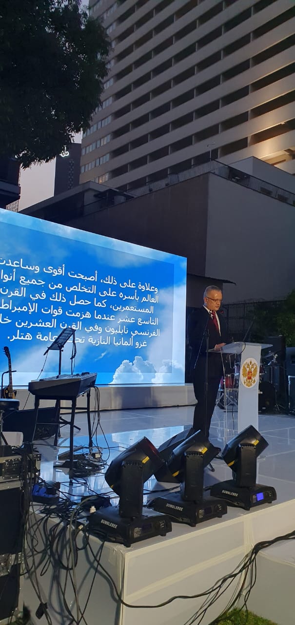 وتابع سفير روسيا بالقاهرة، في كلمته بعد السلام الوطني لمصر: روسيا الاتحادية هي دولة يعود تاريخها الحديث إلى عام 1991، وتم إقامة دولة روسيا منذ حوالي 12 قرنا، وهذا بالطبع لا يصل إلى سبعة آلاف سنة كما هنا في مصر، ولكن تاريخنا غني أيضا بالأحداث ذات الأهمية العالمية.