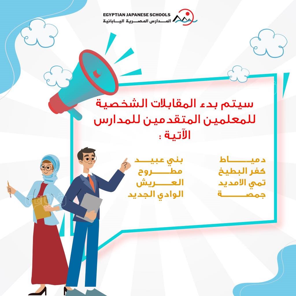وكشفت وحدة المدارس المصرية اليابانية في منشور لها عبر صفحتها الرسمية على موقع التواصل الاجتماعي فيس بوك أنه وحدة المدارس المصرية اليابانية، عن سيتم بدء المقابلات للمعلمين والمعلمات المتقدمين للعمل في فروع المدارس المصرية اليابانية الآتية: (دمياط /كفر البطيخ / جمصة / بني عبيد / مرسى مطروح / العريش / الوادي الجديد )، مشيرة إلى أنه سيتم عمل المقابلات قريبا لباقي المدارس