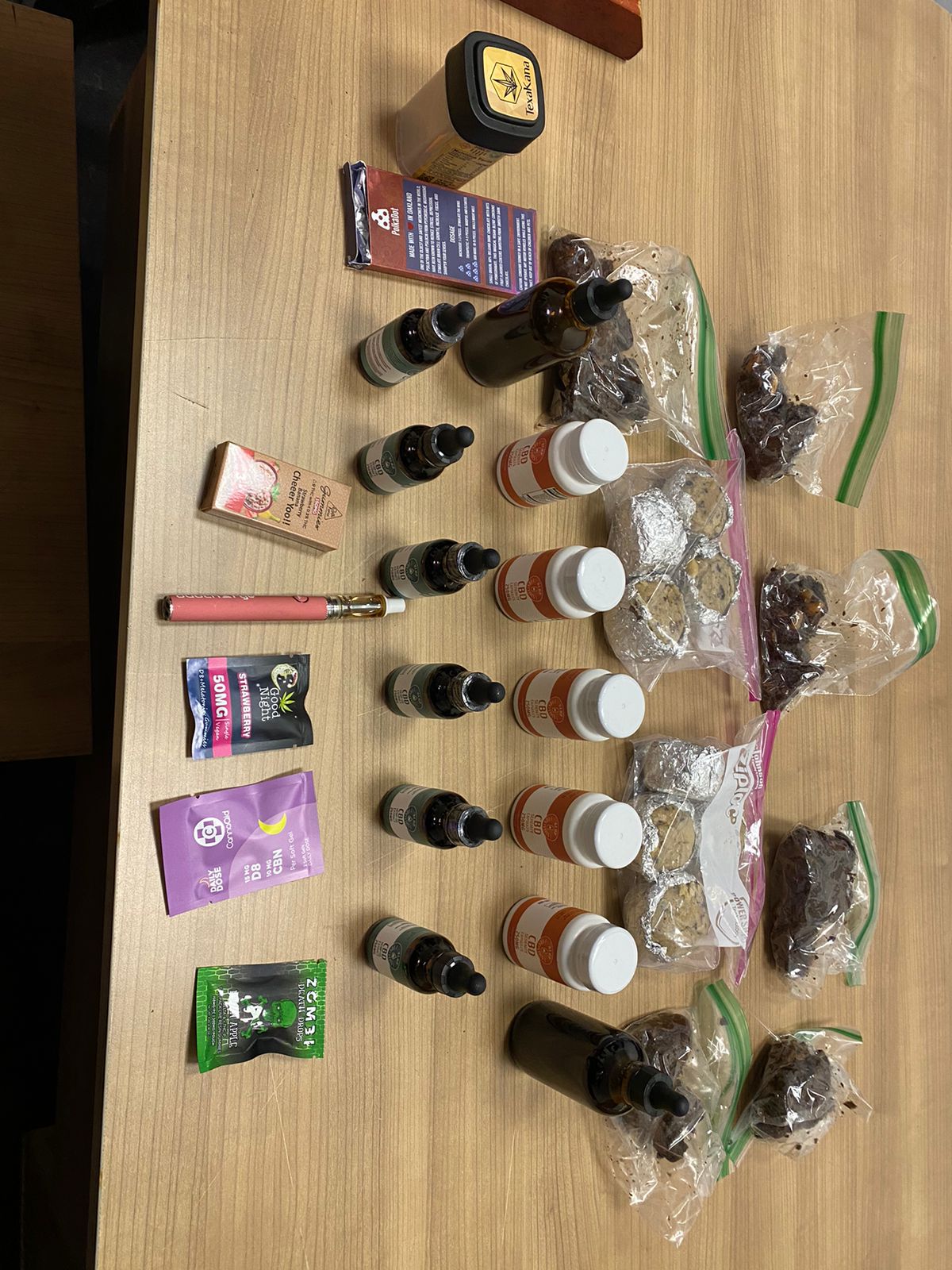 وقام جورج الفونس مدير الحركة المشرف على صالة الوصول بمبني الركاب رقم ٣، بتكليف مصطفي صادق مأمور الجمرك، بتفتيش حقائب الراكبة يدويا مما اسفر عن ضبط زجاجات وبرطمانات وعبوات بلاستيكية واكياس بهم زيوت وسوائل واقراص وحلوي وكيك وشيكولاته من مادتي CBD وTHC المخدرتين باجمالي ٢٨ عبوة وبوزن إجمالي حوالي كيلو جرام ونصف، وشاركت في الضبط بسمة حسني عبد الحميد مأمور الجمرك.