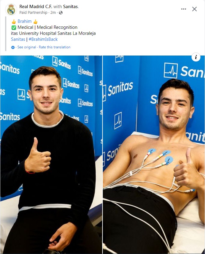 وكتب نادي ريال مدريد في تدوينة له عبر الفيس بوك "براهيم دياز يجري فحص طبي في مستشفى جامعة إتاس سانيتاس لا موراليا"
