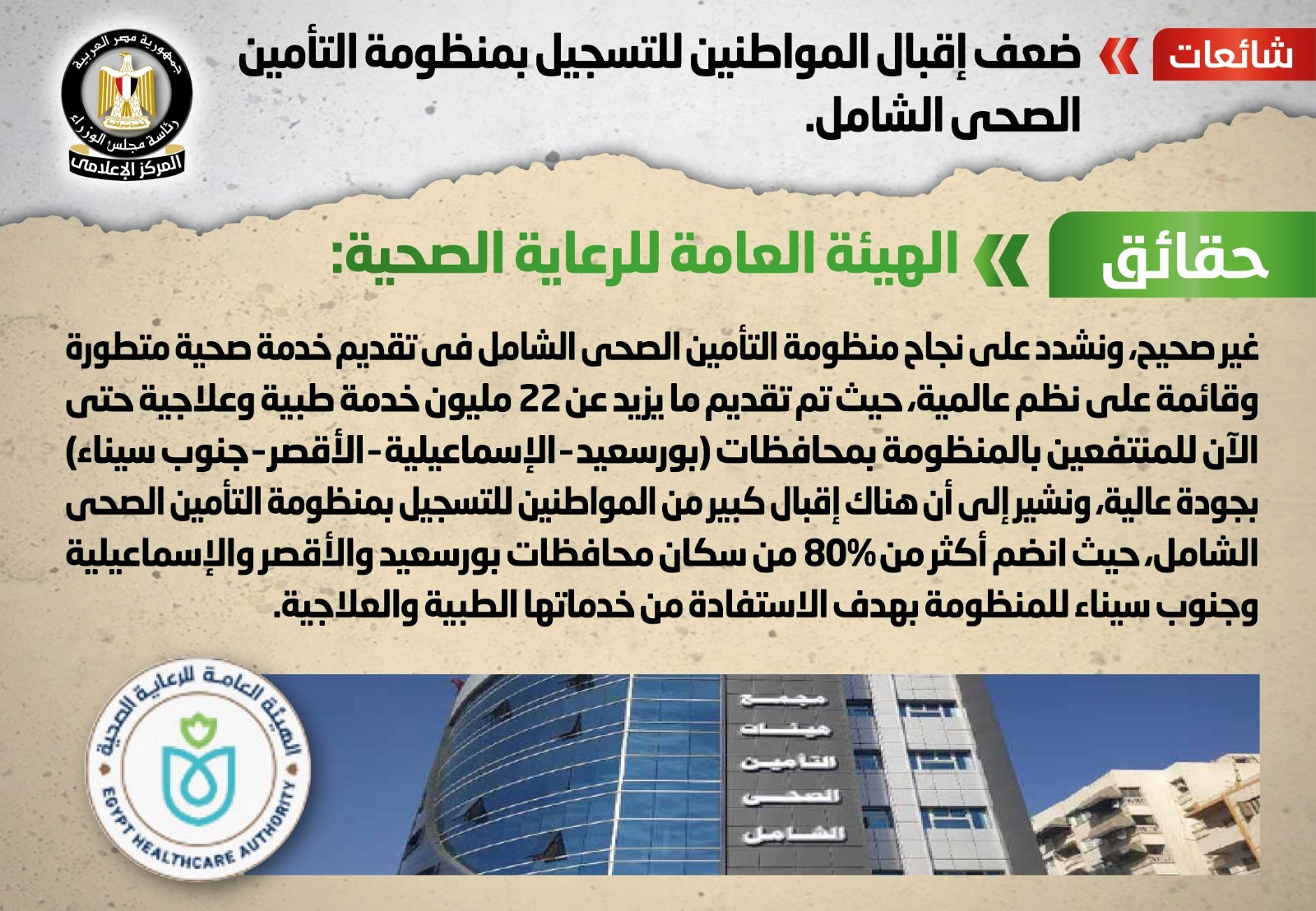 وقد قام المركز الإعلامي لمجلس الوزراء بالتواصل مع الهيئة العامة للرعاية الصحية، والتي نفت تلك الأنباء، مُؤكدةً أنه لا صحة ضعف إقبال المواطنين للتسجيل بمنظومة التأمين الصحي الشامل، مُشددةً على نجاح منظومة التأمين الصحي الشامل في تقديم خدمة صحية متطورة وقائمة على نظم عالمية.