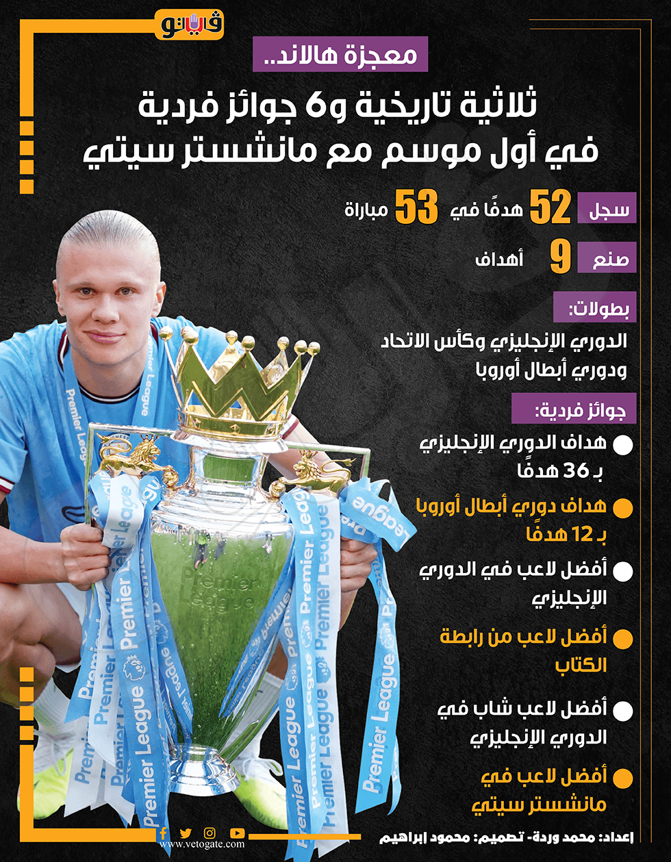 معجزة هالاند.. ثلاثية تاريخية و6 جوائز فردية في أول موسم مع مانشستر سيتي (إنفوجراف) السبت 17/يونيو/2023 - 09:08 م 6/17/2023 9:08:12 PM إرلينج هالاند، فيتو محمد وردة شارك طباعة 18 حجم الخط شارك طباعة هالاند ارلينج هالاند مانشستر سيتي الدوري الانجليزي دوري ابطال اوروبا