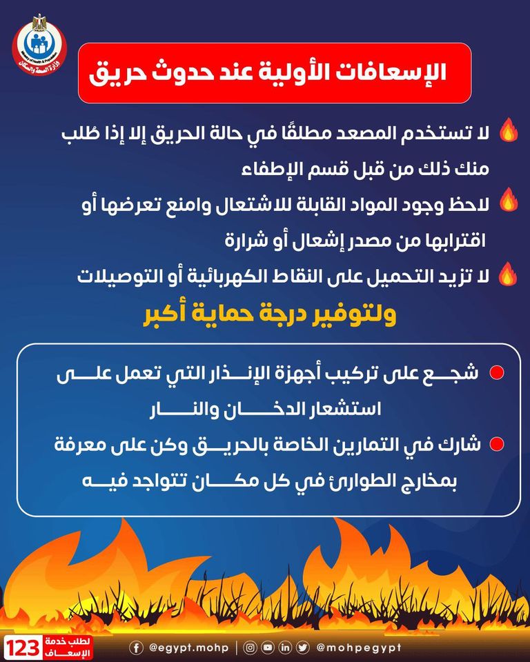 الصحة توضح الإسعافات الأولية التي يجب اتباعها عند حدوث حريق