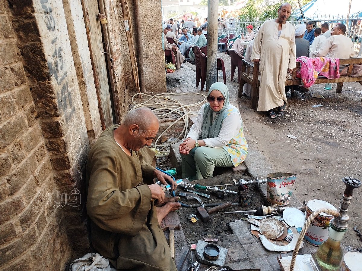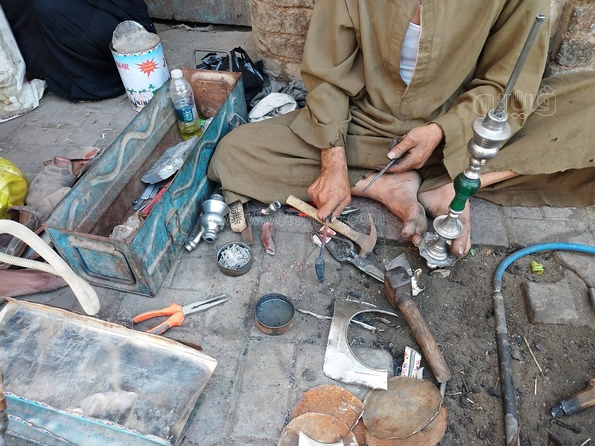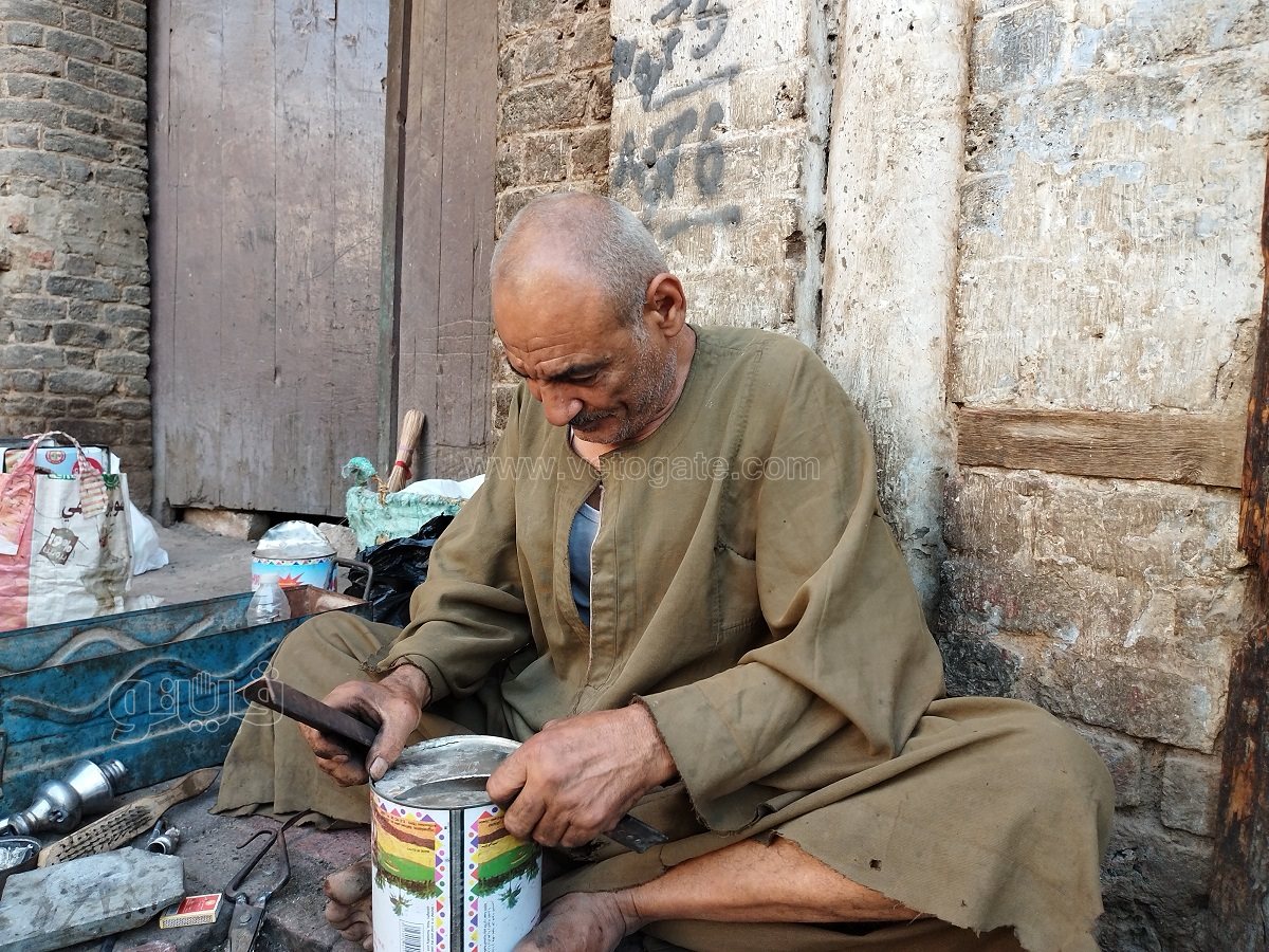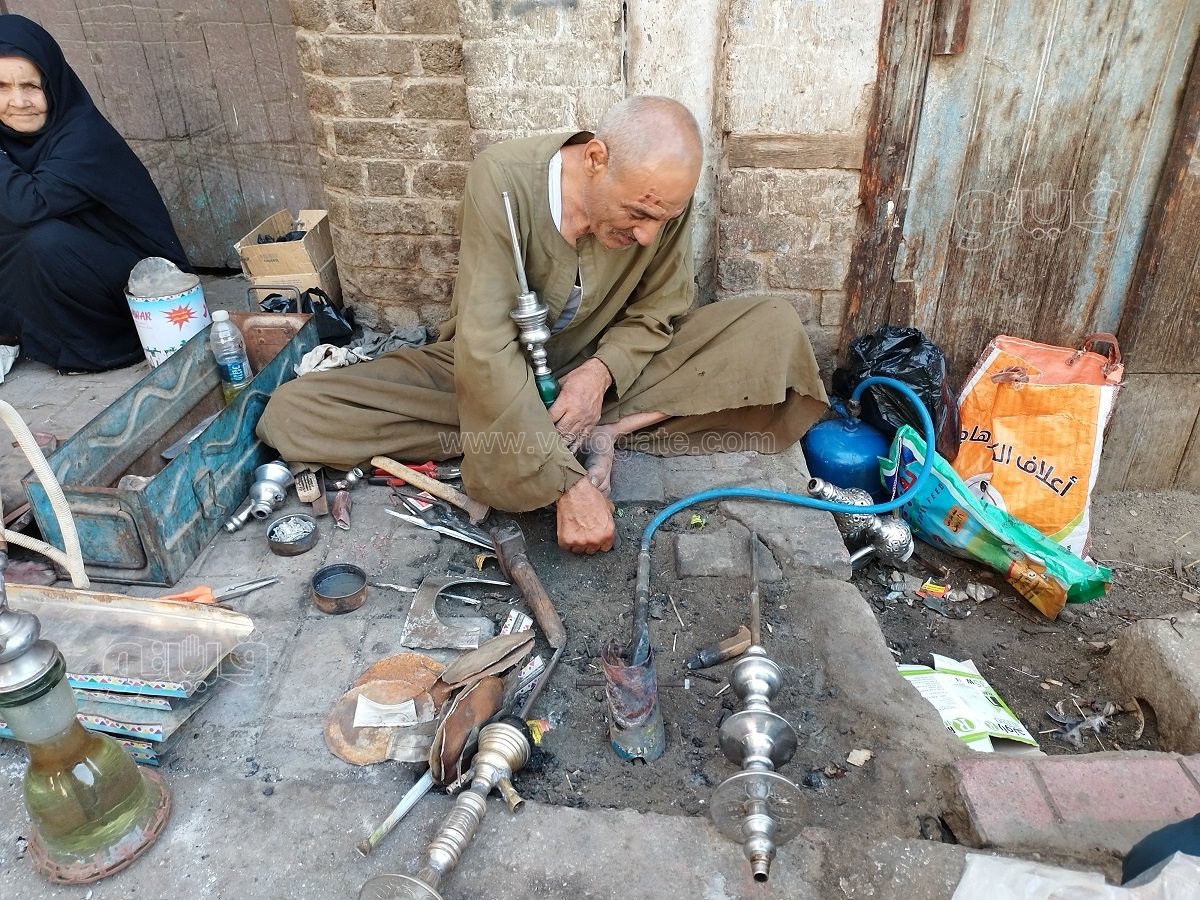 يجلس على حافة أحد الأرصفة بقنا، مرتديا جلبابه الصعيدي، وإلى جواره وابور موصل بأسطوانة غاز، للحام الأواني المعدنية، بالإضافة إلى صناعة صيجان الكعك والبسكويت من صفائح السمن الفارغة، بجواره ترى السيدات ممسكات بأوانيهم لإصلاحها أو بعلب السمن الفارغة لتحويلها إلى صيجان.