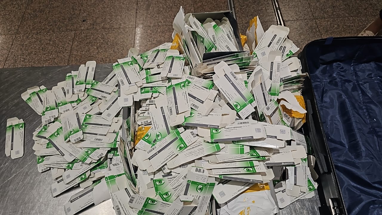 الحالة الأولى كانت أثناء إنهاء الإجراءات الجمركية على ركاب رحلة الخطوط المصرية القادمة من موسكو استوقف مصطفى بحر مأمور الجمرك المعين علي لجنة الخط الأخضر إحدى الراكبات أثناء محاولتها الخروج من بوابة اللجنة الجمركية والتي أنكرت حوزتها لما يجب الإفصاح عنه أو ما يستحق عنه ضرائب ورسوم جمركية، وبتفتيش حقائبها على جهاز الفحص بالأشعة بواسطة كل من محمد عبد الحميد مأمور الجمرك وفرج حمدي رئيس القسم واللذان تلاحظ لهما وجود كثافات عضوية تكرارية متماثلة داخل الحقائب، قام أمير أحمد مطر مدير الحركة المشرف على صالة الوصول بمبنى الركاب رقم ٣ بتكليف محمد يوسف محمد رئيس القسم بتفتيش حقائب الراكبة يدويًّا مما أسفر عن وجود كمية من العبوات الدوائية الخاصة بمرهم للعين، قامت لجنة مكونه من مريم عادل صادق ومها ممدوح إبراهيم بتفتيش الراكبة يدويًّا، ولجنة مكونة من أحمد مدين وهيثم أحمد وأحمد عادل مهني مأموري الجمرك لجرد وعد وتحريز المضبوطات والتي بلغ عددها ١٤٠٠ عبوة.