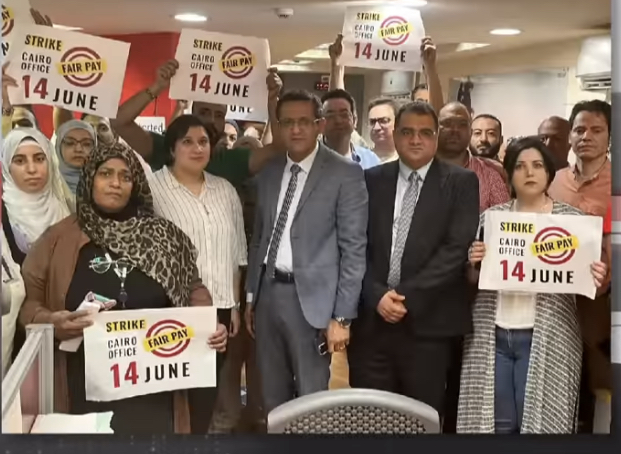 بي بي سي،، 70 صحفيا وإداريًا أو يزيدون قليلًا أعلنوا إضرابًا مؤقتًا داخل مكتب الإقليمي لهيئة الإذاعة البريطانية «بي بي سي,, BBC» في القاهرة، اليوم الأربعاء، احتجاجًا على تراجع رواتبهم، وسياسة التمييز في الأجور- على حد قولهم- مقارنة بالمكاتب التابعة للهيئة البريطانية في عواصم أخرى بالشرق الأوسط، والمطالبة باحتساب رواتبهم بالدولار نظرًا لتراجع قيمة العملة المحلية.