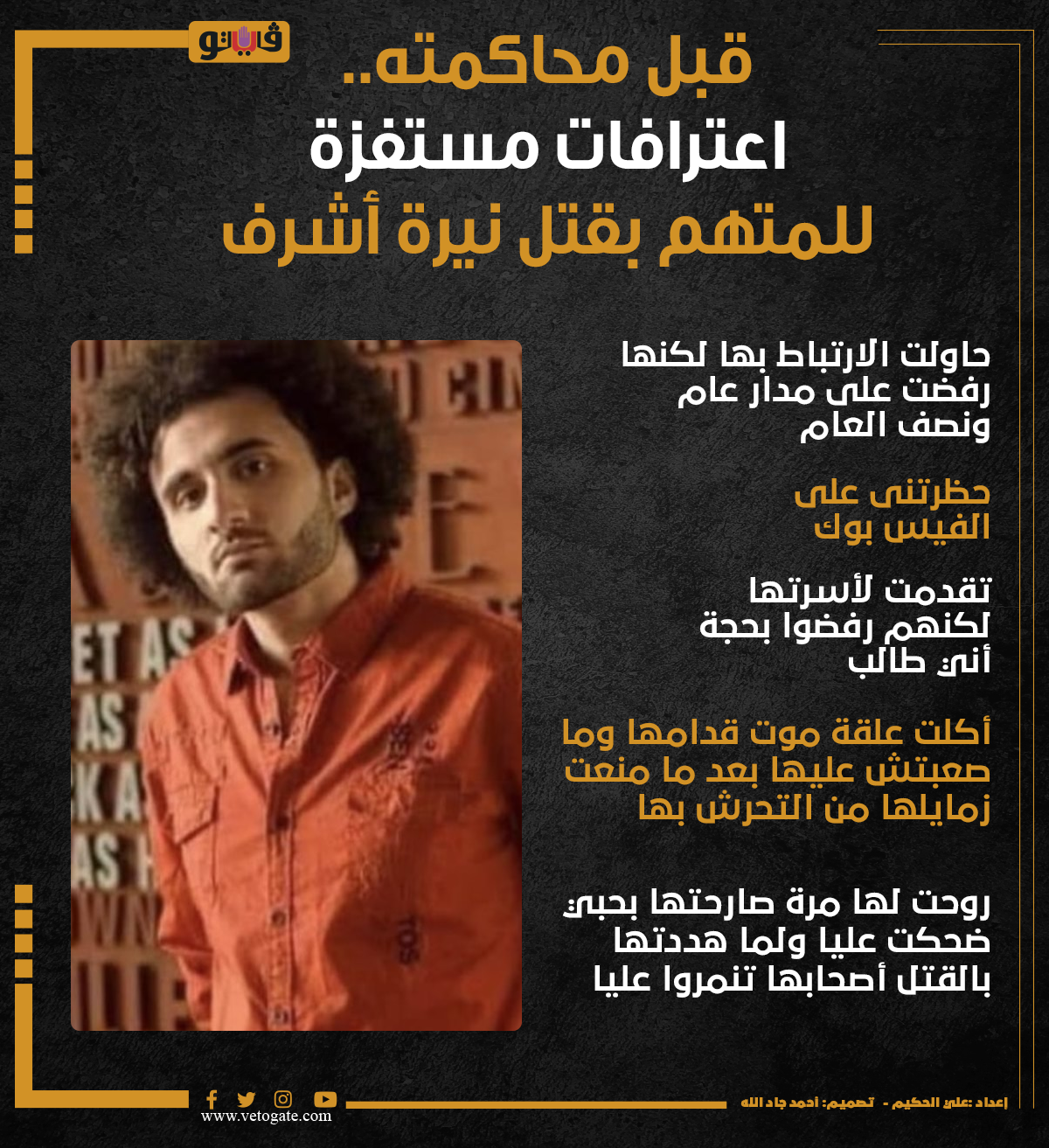 وكشف المتهم سر ارتكابة جريمة قتل الطالبة نيرة اشرف حيث أكد قتله المجني عيلها عمدًا مع سبق الإصرار للخلافات التي كانت بينهما ورفضها الارتباط به.