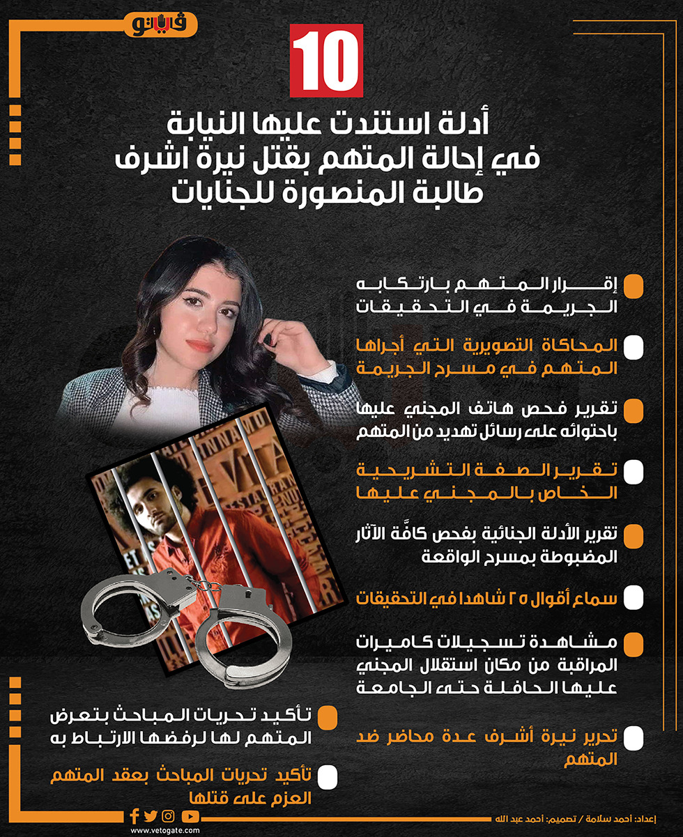 وكانت النيابة العامة قد أقامت الدليل قبل المتهم من شهادة خمسة وعشرين شاهدًا منهم طلاب، وأفراد أمن الجامعة، وعمال بمحلات بمحيط الواقعة، أكدوا رؤيتهم المتهم حال ارتكابها، وفي مقدمتهم زميلات المجني عليها اللاتي كن بصحبتها حينما باغتها المتهم، وآخرون هددهم حينما حاولوا الذود عنها خلال تعديه عليها، وكذا ذوو المجني عليها، وأصدقاؤها الذين أكدوا اعتياد تعرض المتهم وتهديده لها بالإيذاء لرفضها الارتباط به بعدما تقدم لخطبتها، ومحاولته أكثر من مرة إرغامها على ذلك، مما ألجأهم إلى تحرير عدة محاضر ضده، وأن المتهم قبل الواقعة بأيام سعى إلى التواصل مع المجني عليها للوقوف على توقيت استقلالها الحافلة التي اعتادت ركوبها إلى الجامعة، ورفضها إجابته.