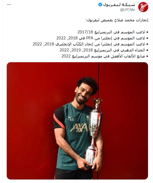 في الوقت الذي احتفلت شبكة ليفربول الرسمية بميلاد محمد صلاح بسر إنجازاته مع ليفربول فقالت: "إنجازات محمد صلاح بقميص ليفربول: •لاعب الموسم في البريميرليج 2017/18.. • لاعب الموسم في إنجلترا من PFA في 2018, 2022.. • لاعب الموسم في إنجلترا من إتحاد الكتّاب الإنجليزي 2018, 2022.. • الحذاء الذهبي في البريميرليغ 2018, 2019, 2022.. • صانع الألعاب الأفضل في موسم البريميرليغ 2022"
