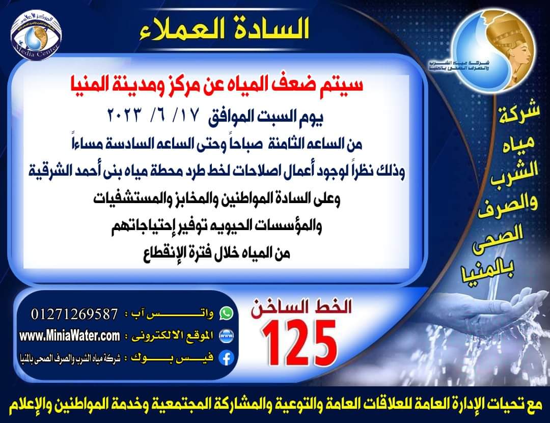 وكانت شركة مياه الشرب والصرف الصحي بالمنيا، برئاسة المهندس رجب السعيد جبر رئيس مجلس الإدارة والعضو المنتدب للشركة، قد أعلنت عن قطع المياه عن حي جنوب مدينة المنيا، بسبب تسريب مياه بخط 500 مم بمنطقة التنظيم والإدارة جنوب المدينه.