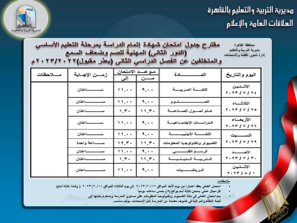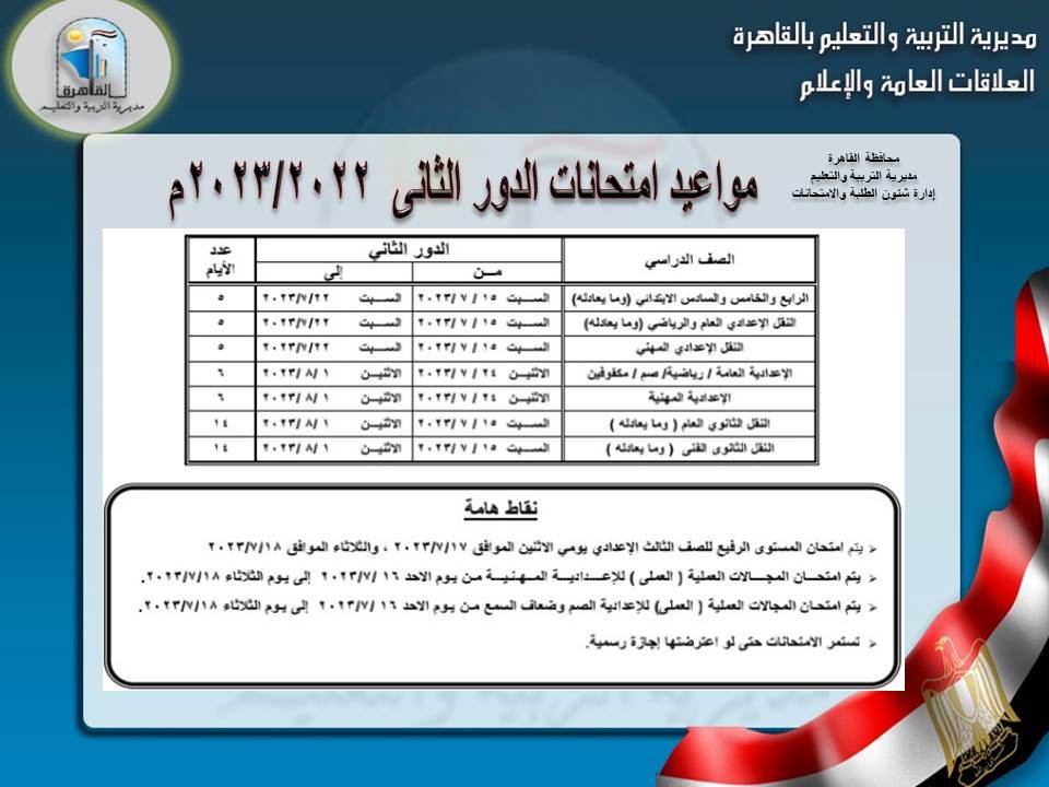 اعتمد اللواء خالد عبد العال محافظ القاهرة، جداول مواعيد امتحانات الدور الثاني للعام الدراسي ٢٠٢٣/٢٠٢٢.