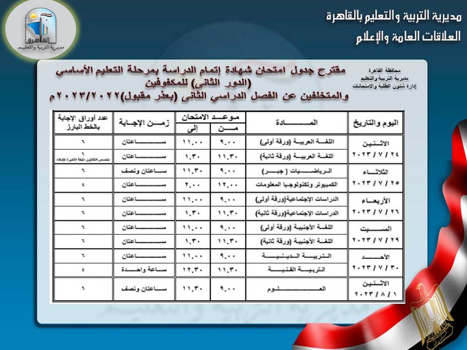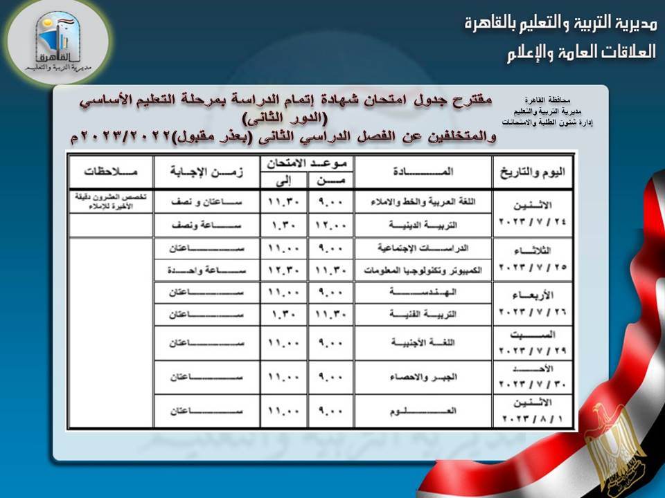 وصرح أيمن موسى، مدير مديرية التربية والتعليم بالقاهرة، بأن الامتحانات تكون وفقًا للجداول المعلنة، حيث يؤدى طلاب الصف الرابع والخامس والسادس الابتدائى (وما يعادله) الامتحانات خلال الفترة من السبت الموافق ٢٠٢٣/٧/١٥ حتى السبت الموافق ٢٠٢٣/٧/٢٢