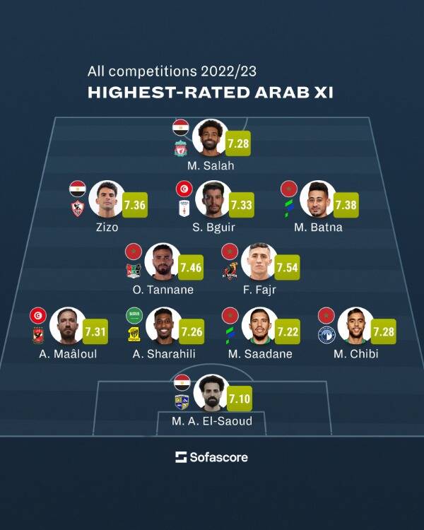 كشفت شبكة سوفا سكور العالمية الشهيرة المتخصصة بالإحصائيات، عن التشكيلة المثالية للاعبين العرب الأعلى تقييما في جميع المسابقات لموسم 2022-2023.