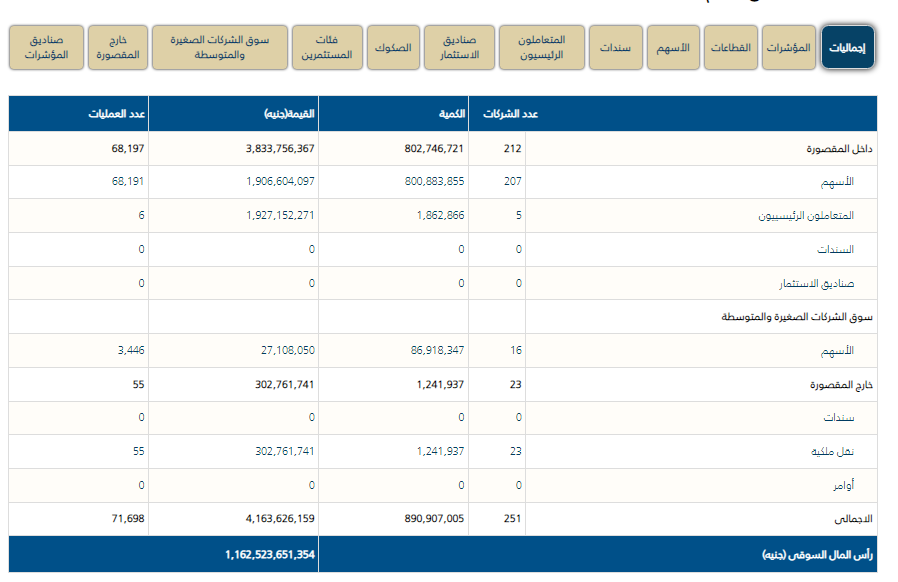 وتباينت مؤشرات البورصة بختام تعاملات أمس الأربعاء، وخسر رأس المال السوقي 3 مليارات جنيه ليغلق عند مستوى 1.165 تريليون جنيه.