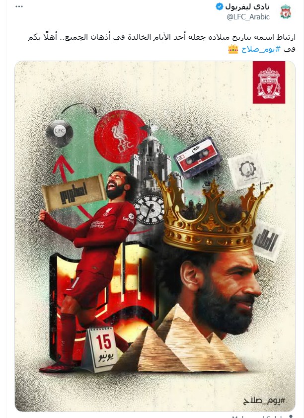 وعن محمد صلاح، كتب نادي ليفربول تغريدة على تويتر "ارتباط اسمه بتاريخ ميلاده جعله أحد الأيام الخالدة في أذهان الجميع.. أهلًا بكم في #يوم_صلاح".
