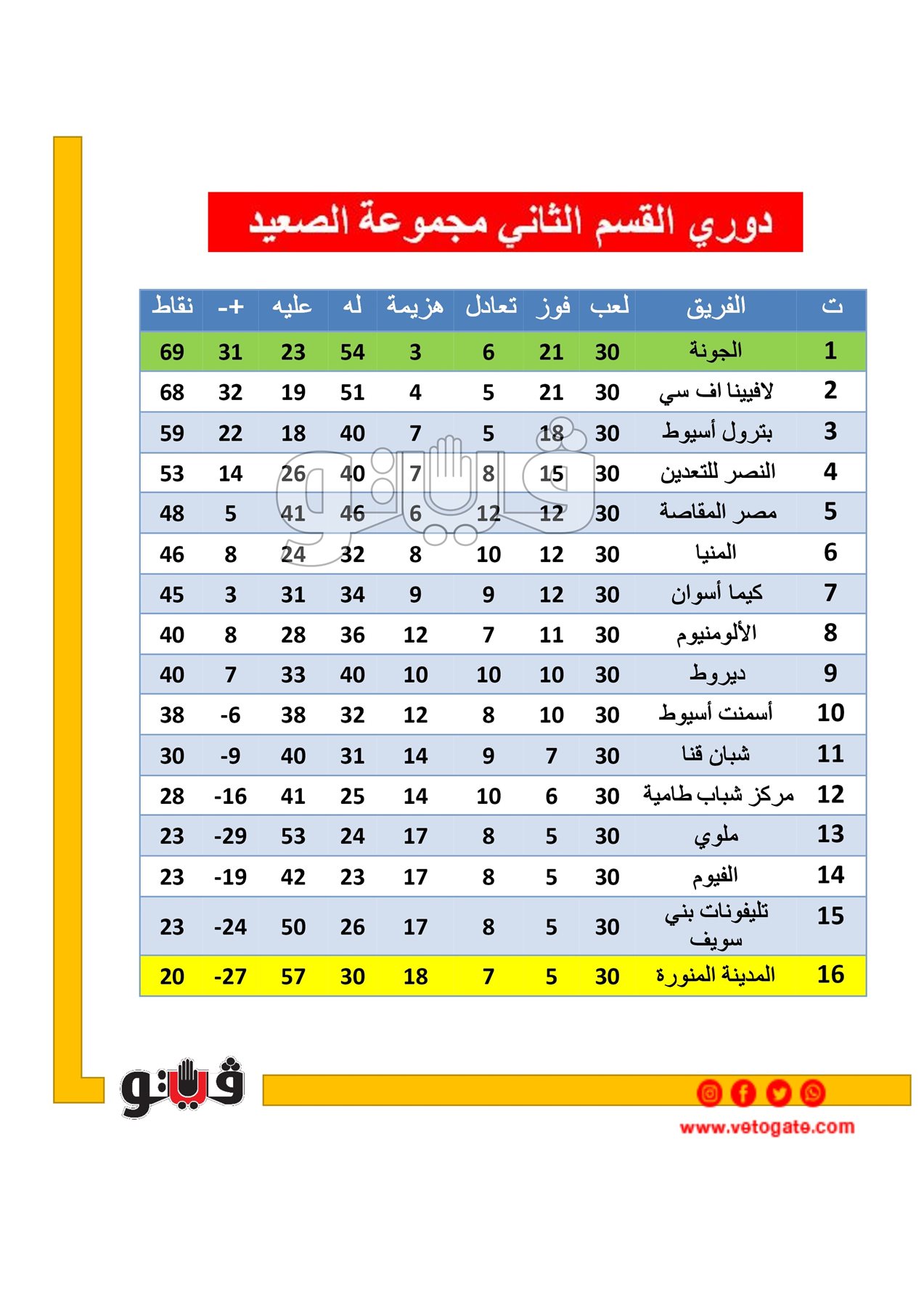 ترتيب دوري القسم الثاني مجموعة الصعيد بعد الجولة الأخيرة