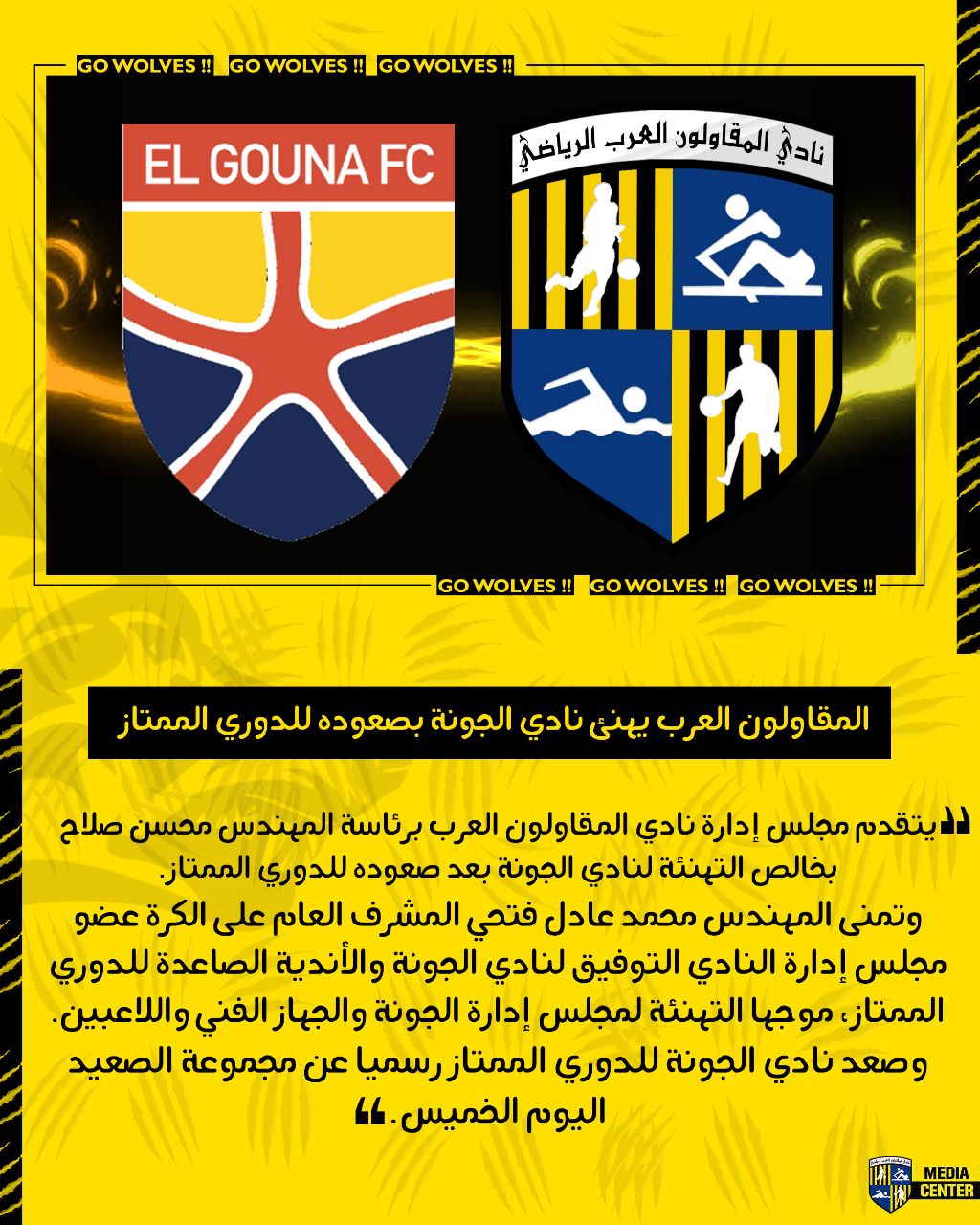 تقدم مجلس إدارة نادي المقاولون العرب برئاسة المهندس محسن صلاح بخالص التهنئة لنادي الجونة بعد صعوده للدوري الممتاز.