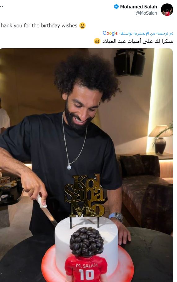ونشر صلاح صورة له على “تويتر" وهو يقوم بتقطيع تورتة تحمل صورة له وعلق عليها قائلًا: "شكرًا لك على أمنيات عيد الميلاد".