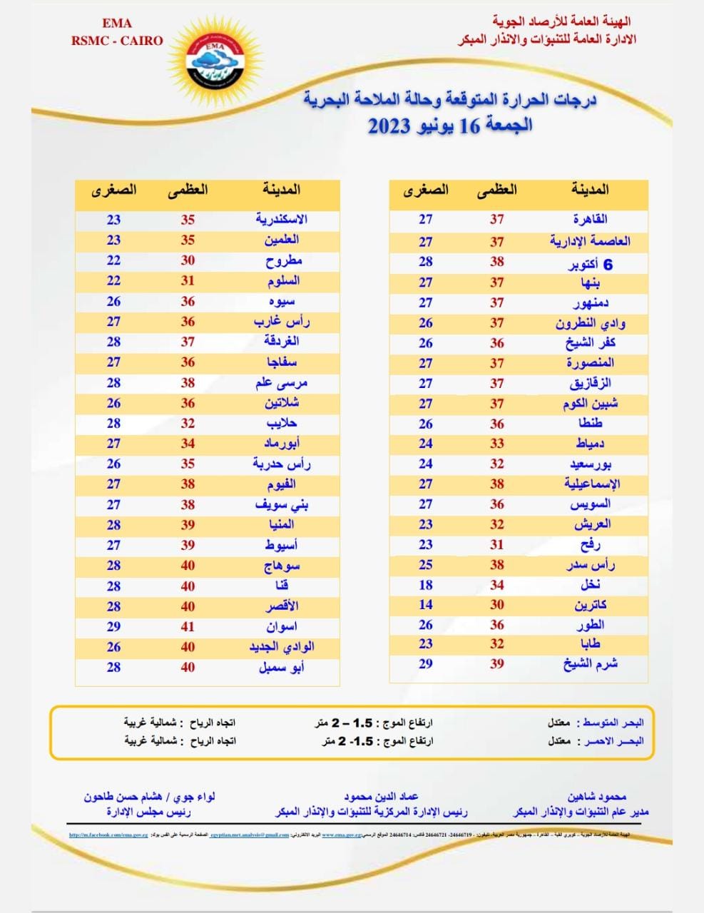 كما أعلنت هيئة الأرصاد الجوية حالة الطقس خلال الأيام المقبلة، حيث يسود طقس معتدل صباحًا، حار نهارًا على القاهرة الكبرى والوجه البحري وشمال الصعيد، مائل للدفء على السواحل الشمالية، شديد الحرارة على جنوب الصعيد وجنوب الصعيد، معتدل ليلًا.