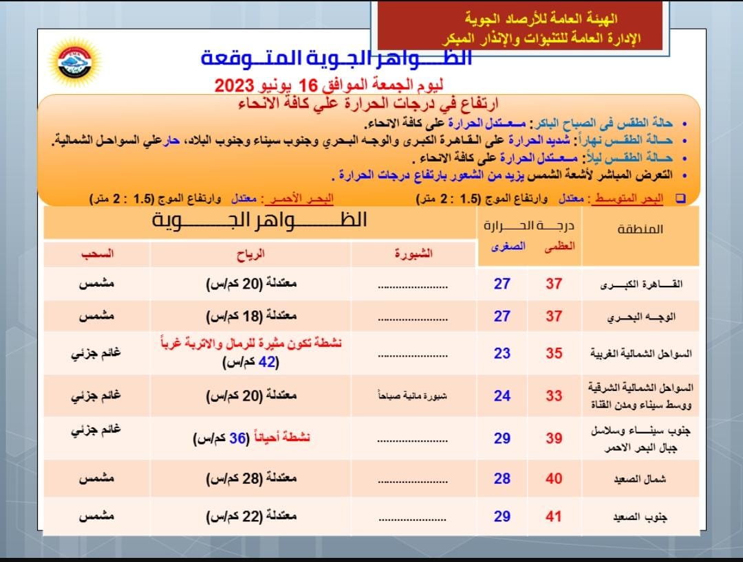 وتوقعت هيئة الأرصاد أن يسود البلاد، طقس شديد الحرارة نهارًا على القاهرة الكبرى والوجه البحري وجنوب سيناء وجنوب البلاد، حار على السواحل الشمالية، معتدل الحرارة ليلًا على الأنحاء كافة.