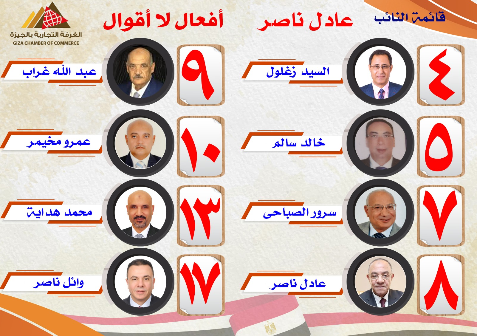 وفيما يخص القائمة الأولى التي تخوض الإنتخابات تحت اسم «قائمة أفعال لا أقوال» وتضم 8 مرشحين بقيادة عادل ناصر، رئيس مجلس إدارة الغرفة التجارية بمحافظة الجيزة، وعبد الله غراب رئيس الشعبة العامة للمخابز بالاتحاد العام للغرف التجارية، وسرور الصباحى عضو مجلس إدارة الغرفة، وعمرو مخيمر، عضو مجلس الإدارة، ومحمد هداية الحداد نائب رئيس شعبة تجار المحمول بالغرفة.