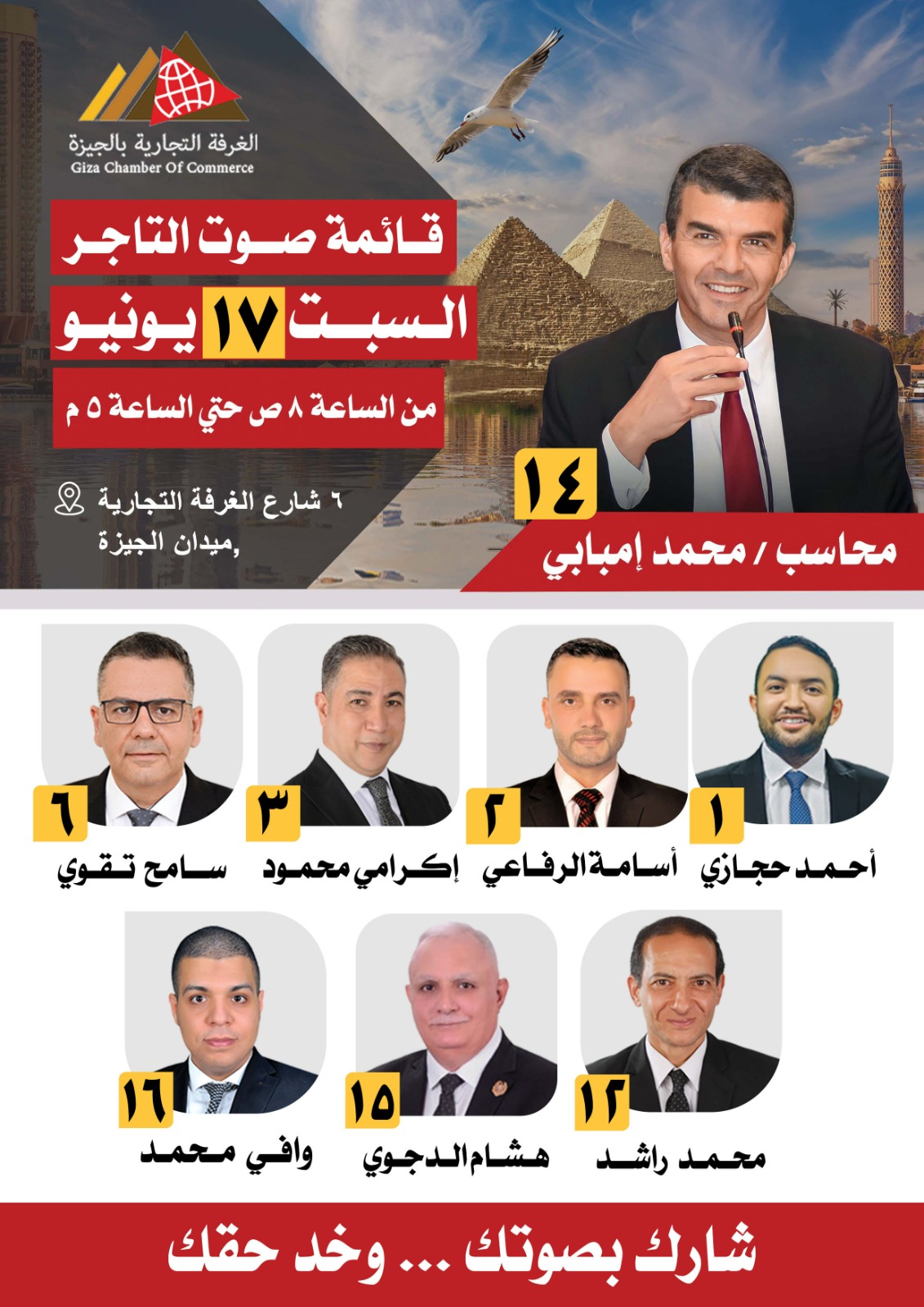 أما القائمة الثانية فتخوض الانتخابات تحت اسم «صوت التاجر»، بقيادة محمد إمبابي، رئيس شعبة المطاعم والفنادق بالغرفة، ورئيس الغرفة السابق، وهشام الدجوى، رئيس شعبة المواد الغذائية بالغرفة، وإكرامى محمود حمدى ونشاطه سكرتير شعبة السياحة، وسامح تقوى، نائب رئيس شعبة الأجهزة الكهربائية، ومحمد راشد، سكرتير شعبة المواد الغذائية، وأسامة رفاعي، وأحمد حجازي، ووافي محمد.