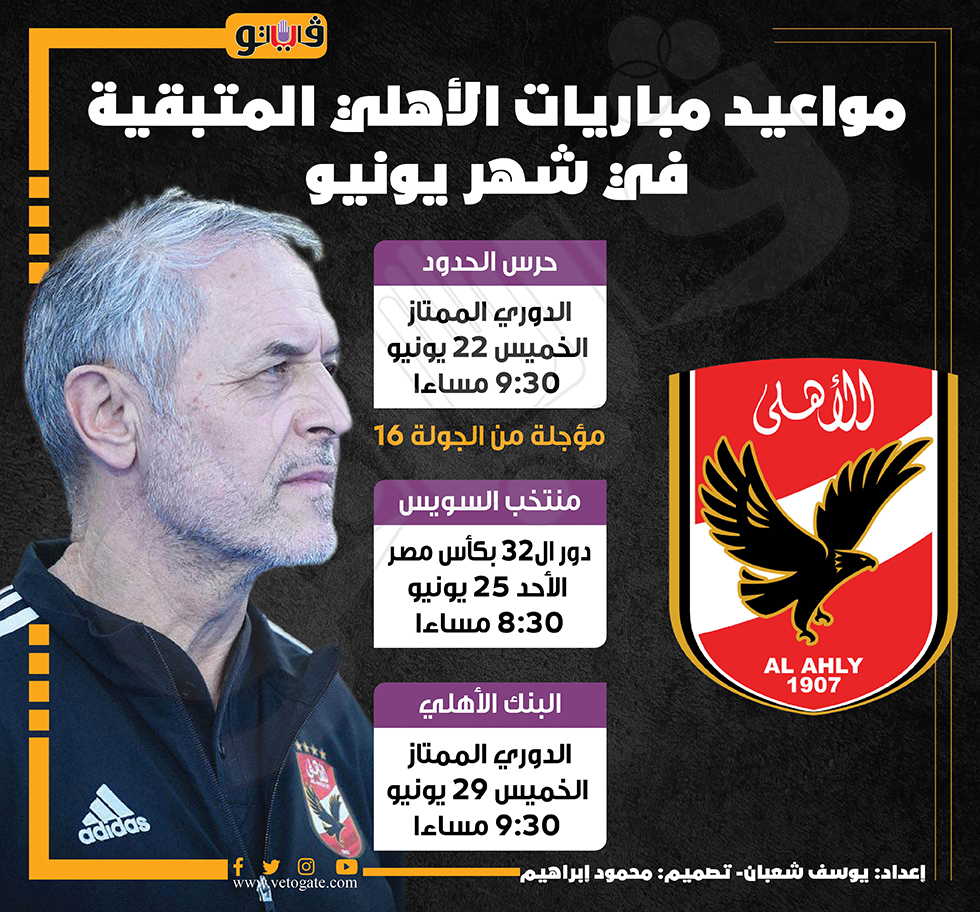 مواعيد مباريات الأهلي المتبقية في شهر يونيو (إنفوجراف) السبت 17/يونيو/2023 - 11:31 ص 6/17/2023 11:31:12 AM فريق الكرة بالنادي الأهلي، فيتو يوسف شعبان شارك طباعة 18 حجم الخط شارك طباعة الأهلي النادي الأهلي اخبار النادي الاهلي دوري أبطال أفريقيا الدوري الممتاز رابطة الأندية المحترفة