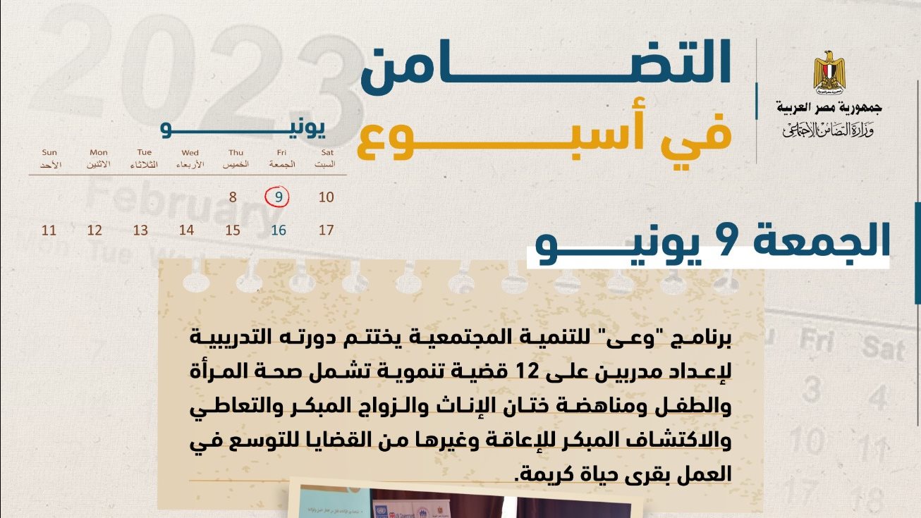 - برنامج "وعى" للتنمية المجتمعية يختتم دورته التدريبية لإعداد مدربين على 12 قضية تنموية تشمل صحة المرأة والطفل ومناهضة ختان الإناث والزواج المبكر والتعاطي والاكتشاف المبكر للإعاقة... وغيرها من القضايا للتوسع في العمل بقرى حياة كريمة.