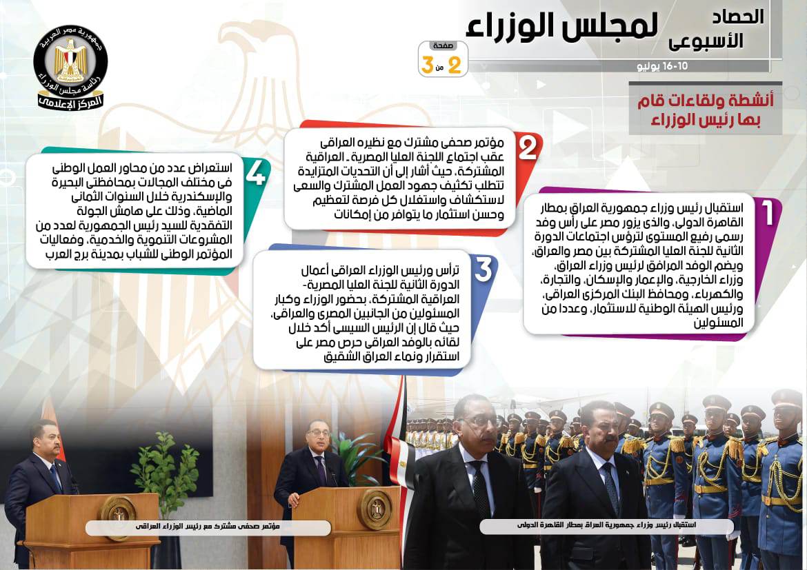 وبشأن الأنشطة التي قام بها رئيس مجلس الوزراء، فبحسب التقرير قام باستقبال رئيس وزراء جمهورية العراق بمطار القاهرة الدولي، والذي يزور مصر على رأس وفد رسمي رفيع المستوى لترؤس اجتماعات الدورة الثانية للجنة العليا المشتركة بين مصر والعراق، ويضم الوفد المرافق لرئيس وزراء العراق، وزراء الخارجية، والإعمار والإسكان، والتجارة، والكهرباء، ومحافظ البنك المركزي العراقي، ورئيس الهيئة الوطنية للاستثمار، وعددًا من المسئولين، وكذلك ترأس ورئيس الوزراء العراقي أعمال الدورة الثانية للجنة العليا المصرية-العراقية المشتركة، بحضور الوزراء وكبار المسئولين من الجانبين المصري والعراقي، حيث قال إن الرئيس السيسي أكد خلال لقائه بالوفد العراقي حرص مصر على استقرار ونماء العراق الشقيق، في حين عقد مؤتمرا صحفيا مشتركا مع نظيره العراقي عقب اجتماع اللجنة العليا المصرية ـ العراقية المشتركة، حيث أشار إلى أن التحديات المتزايدة تتطلب تكثيف جهود العمل المشترك والسعي لاستكشاف واستغلال كل فرصة لتعظيم وحسن استثمار ما يتوافر من إمكانات، فيما شهد ونظيره العراقي افتتاح فعاليات منتدى رجال الأعمال المصري -العراقي، حيث أكد حرص الدولة الشديد على تعزيز الشراكة والتعاون بين الشركات المصرية والعراقية، وذلك بحضور عدد من الوزراء من الجانبين، وممثلي القطاع الخاص من مصر والعراق.