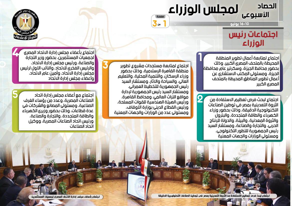 فضلًا عن اجتماع لمتابعة مستجدات مشروع تطوير منطقة القاهرة الإسلامية، وذلك بحضور وزراء الإسكان، والتنمية المحلية، والتعليم العالي، والسياحة والآثار، ومستشار رئيس الجمهورية للتخطيط العمراني، ومستشار رئيس الجمهورية لإدارة مواقع التراث العالمي، ومحافظ القاهرة، ورئيس الهيئة الهندسية للقوات المسلحة، ورئيس القطاع الديني بوزارة الأوقاف، ومسئولي عدد من الوزارات والجهات المعنية، بالإضافة إلى اجتماع لبحث فرص تعظيم الاستفادة من الثروة التعدينية بمصر في توطين الصناعات التكنولوجية الدقيقة، وذلك بحضور وزراء الكهرباء والطاقة المتجددة، والبترول والثروة المعدنية، والبيئة، والدولة للإنتاج الحربى، والتجارة والصناعة، ومستشار رئيس الجمهورية للتطور التكنولوجي، ومسئولي الوزارات والجهات المعنية، إلى جانب اجتماع بأعضاء مجلس إدارة الاتحاد المصري لجمعيات المستثمرين، بحضور وزير التجارة والصناعة، ورئيس مجلس إدارة الاتحاد، والرئيس الفخري للاتحاد، والنائب الأول لرئيس مجلس إدارة الاتحاد، وأمين عام الاتحاد، وأعضاء مجلس إدارة الاتحاد، وكذلك اجتماع مع أعضاء مجلس إدارة اتحاد الصناعات المصرية، وعدد من رؤساء الغرف الصناعية، ومسئولي المصانع والشركات في عدة قطاعات، وذلك بحضور وزيري الكهرباء والطاقة المتجددة، والتجارة والصناعة، ورئيس اتحاد الصناعات المصرية، ووكيل اتحاد الصناعات.