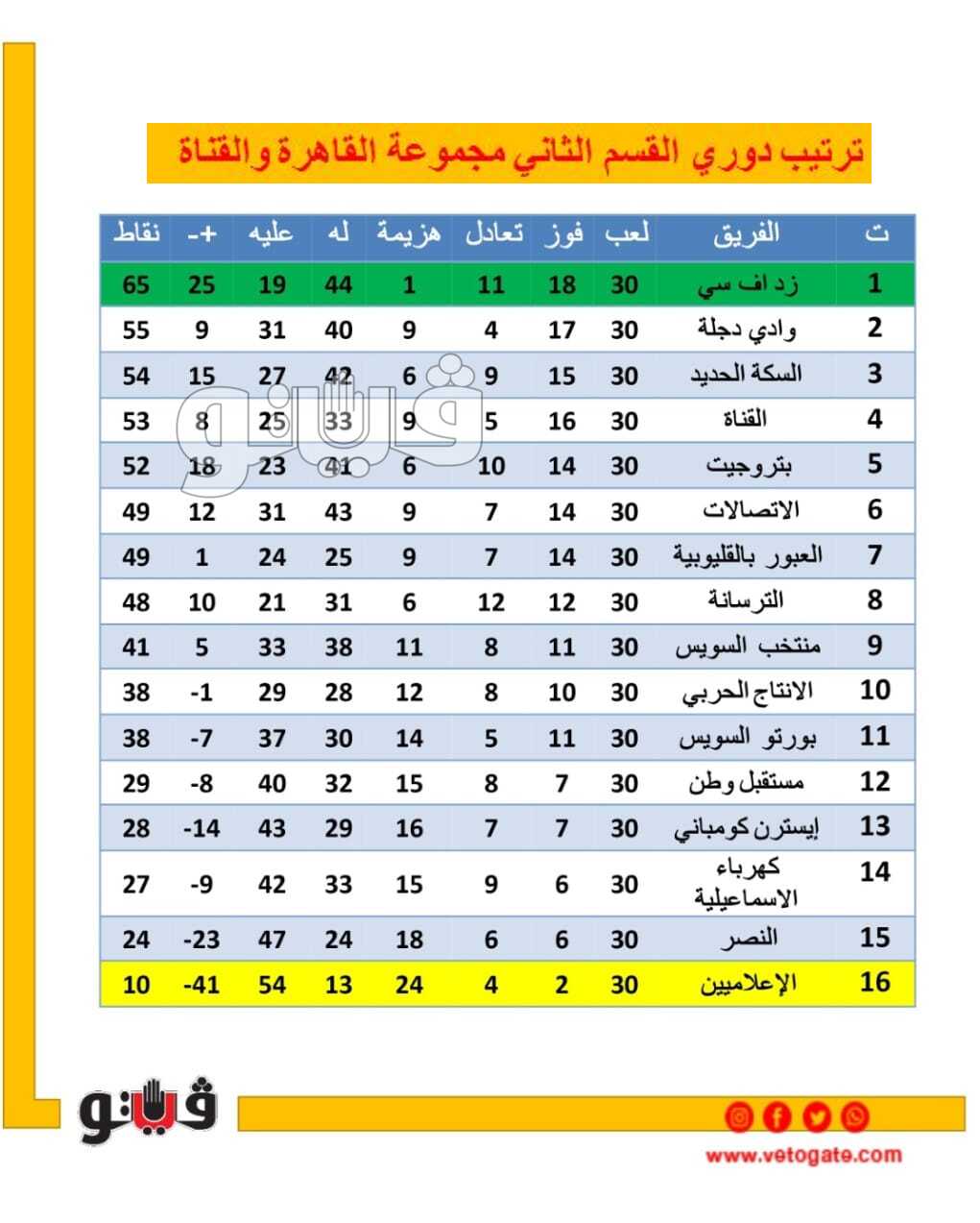 ترتيب دوري القسم الثاني مجموعة القاهرة والقناة بعد نهاية المسابقة