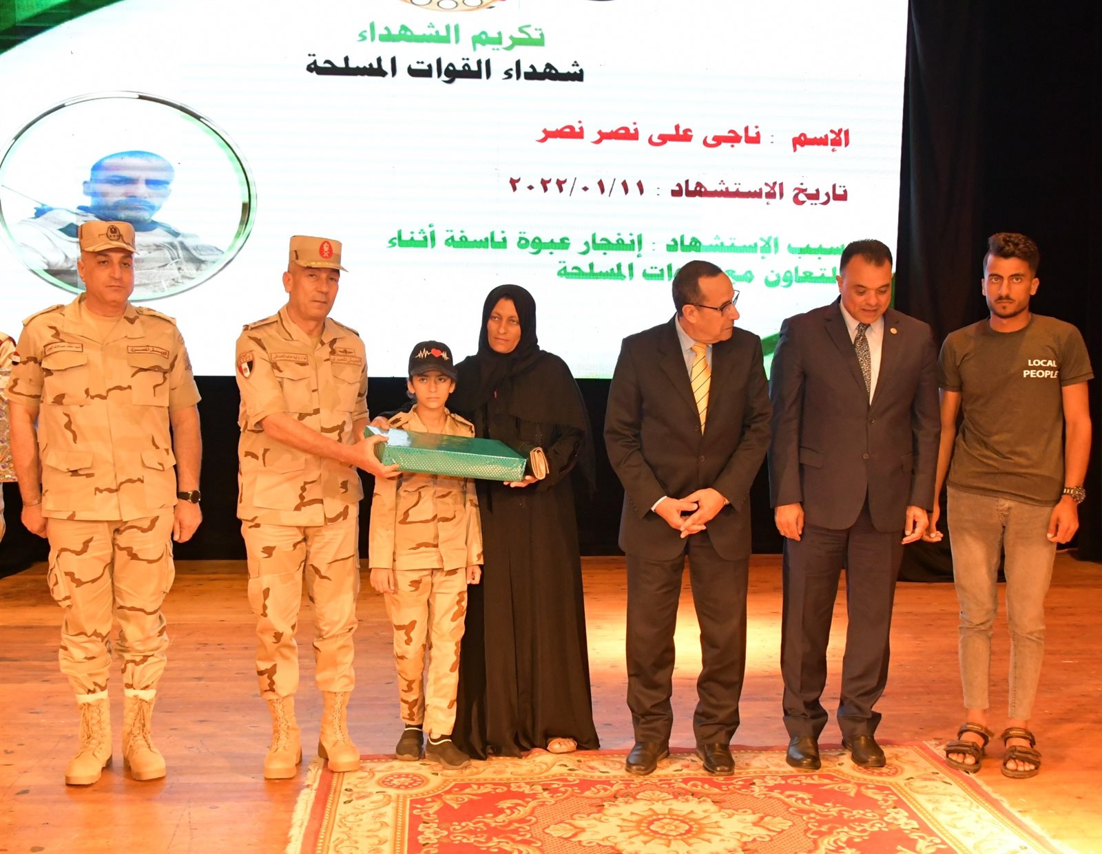 كما تم تكريم عدد من أسر الشهداء من المدنيين الذين ضحوا بالغالى والنفيس خلال تعاونهم مع القوات المسلحة لدحر جذور الإرهاب قبل إستعادة الوضع الآمن وإنطلاق عملية التنمية الشاملة المتكاملة بشمال سيناء، بالإضافة إلى تكريم عدد من الطلائع المتميزين فى المجالات المختلفة، وأختتمت الندوة بعزف السلام الوطنى لجمهورية مصر العربية.