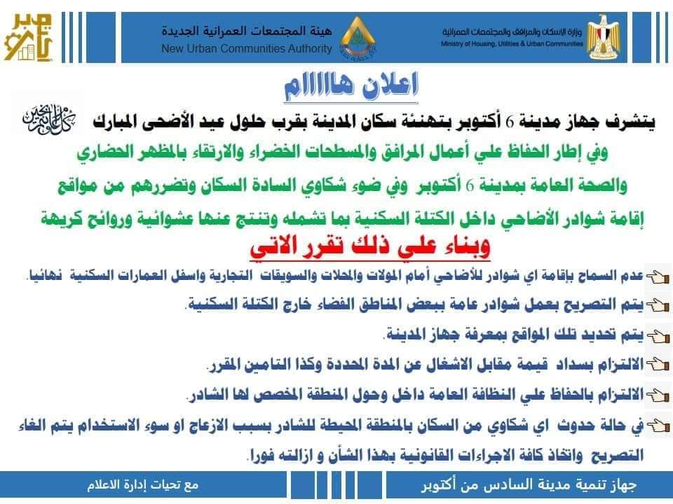 6 أكتوبر، شدد جهاز مدينة السادس من أكتوبر على منع اقامة شوادر الأضاحي أمام المولات والمحلات والأسواق التجارية واسفل العمارات السكنية نهائيا.