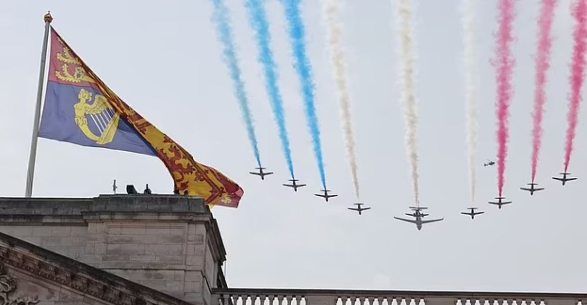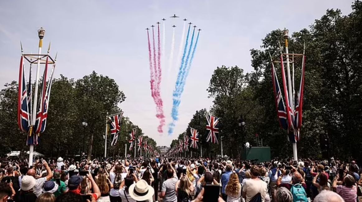والمفارقة هذا العام كانت العرض الجوي التقليدي الذي اختتم الاحتفال تعويضًا عن إلغاء العرض الذي كان مقررًا تنظيمه بمناسبة تتويج الملك في السادس من مايو بسبب سوء الأحوال الجوية.
