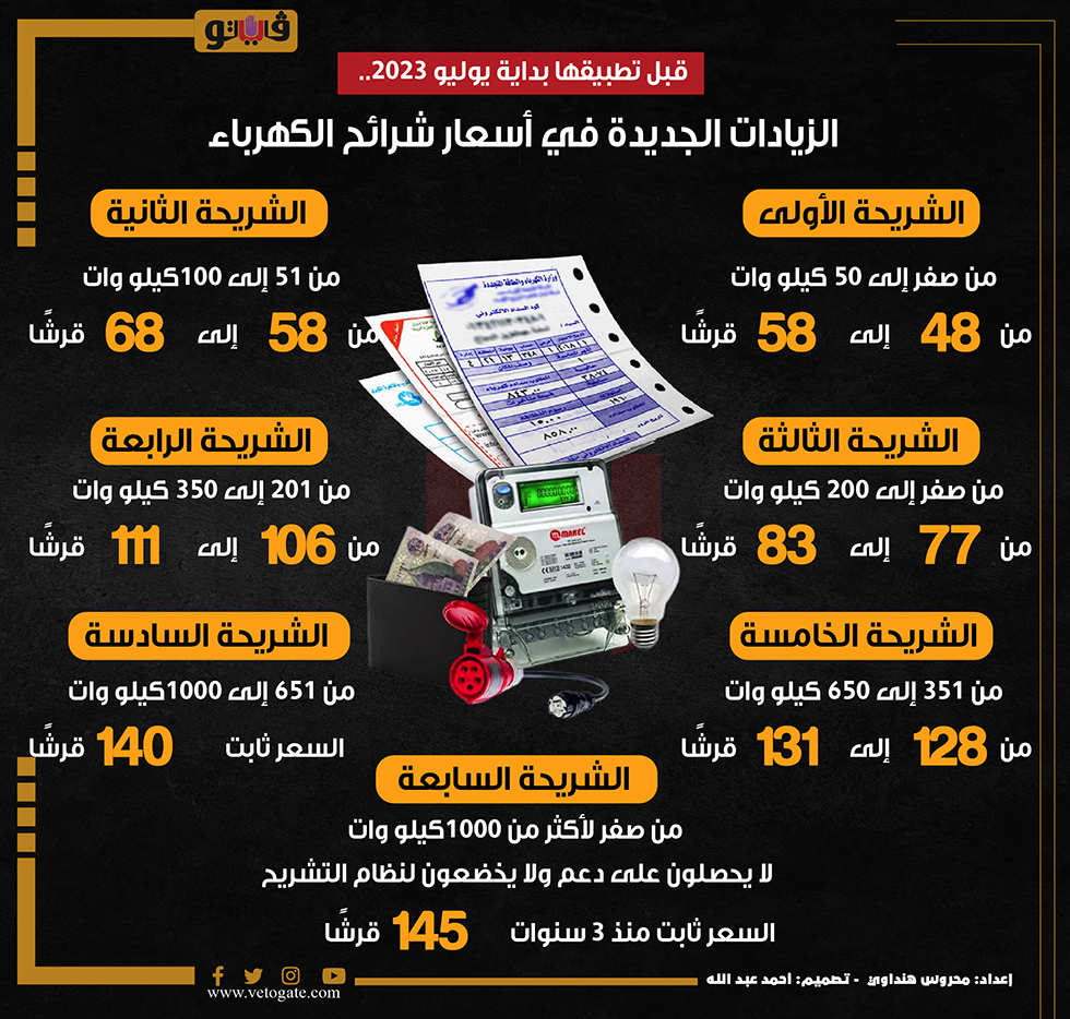 قبل تطبيقها بداية يوليو 2023.. الزيادات الجديدة في أسعار شرائح الكهرباء (إنفوجراف) الأحد 18/يونيو/2023 - 12:58 م 6/18/2023 12:58:44 PM شرائح الكهرباء محروس هنداوي شارك طباعة 18 حجم الخط شارك طباعة اسعار شرائح الكهرباء شرائح الكهرباء تأجيل زيادة اسعار شرائح استهلاك الكهرباء زيادة أسعار شرائح استهلاك الكهرباء شرائح الكهرباء 2023