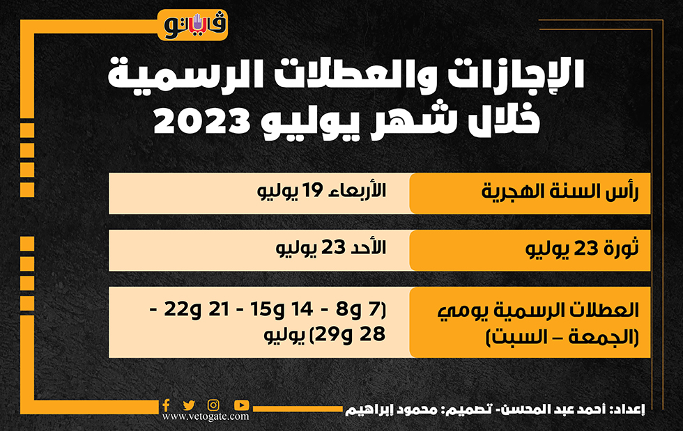الإجازات والعطلات الرسمية خلال شهر يوليو 2023 (إنفوجراف) الإثنين 19/يونيو/2023 - 08:30 م 6/19/2023 8:30:19 PM اجازات الموظفين في يوليو ,فيتو أحمد عبدالمحسن شارك طباعة 18 حجم الخط شارك طباعة رأس السنة الهجرية السنة الهجرية العطلات الرسمية ثورة 23 يوليو الاجازات